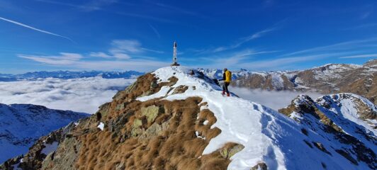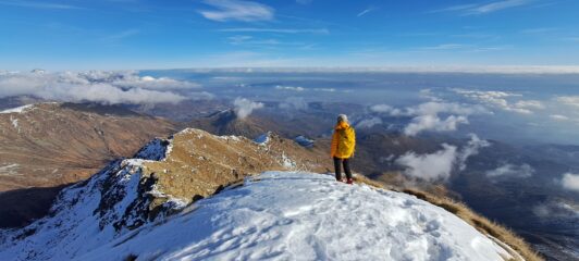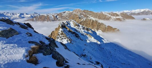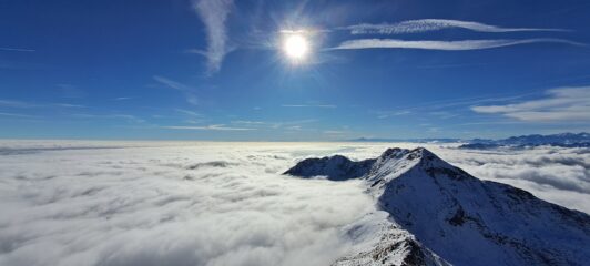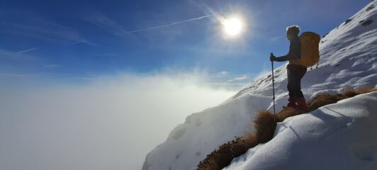 Una gita escursionistica un tempo impossibile a gennaio. Saliti da Pian delle Nere. Dalla cava di Quarzo tratto innevato sino alla cresta, fortunatamente percorso gia’ tracciato; poi sentiero quasi pulito sino al rifugio. Traverso nuovamente innevato ed infine ultimo tratto fatto in parte su erba ripida per evitare zone innevate. Giornata stupenda con mare di nubi. Con Nadia, non incontrato nessuno.