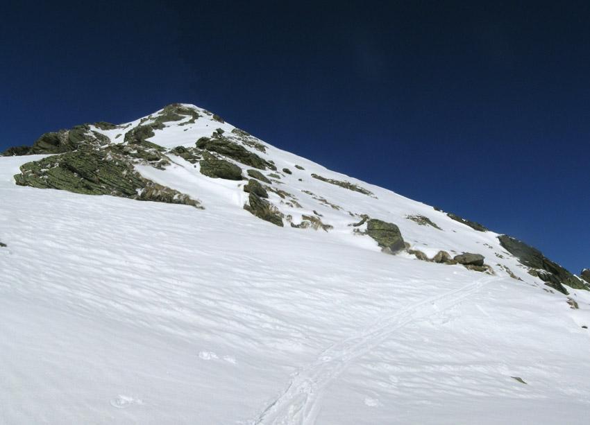 Attraversare a sinistra sotto alcune balze rocciose e prendere il ripido spallone che per pendii sostenuti raggiunge la vetta.