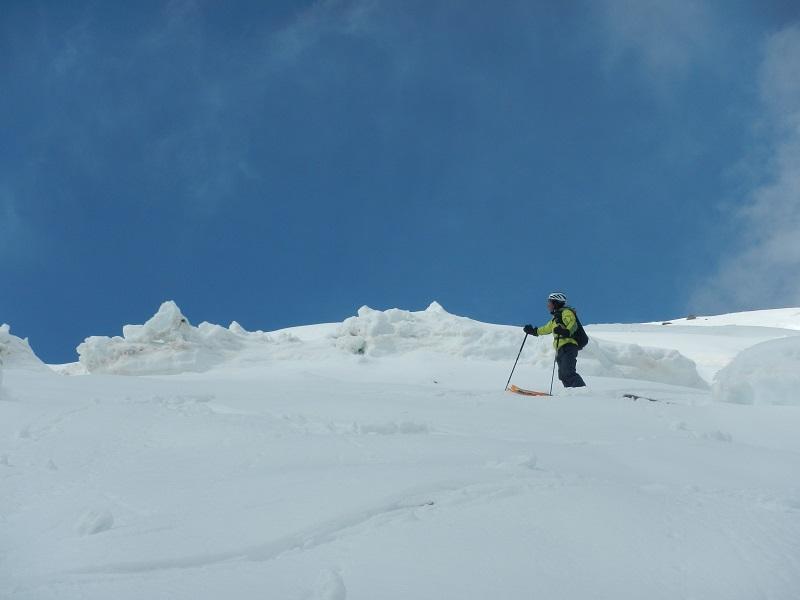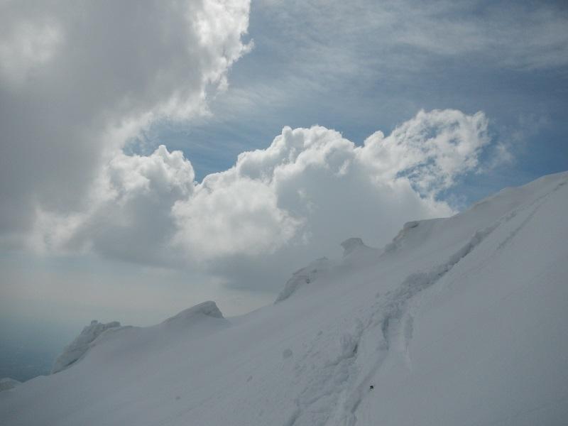 Quest’anno non voleva nessuno, il “K2 canavesano”, cosi abbiamo progettato di scenderlo da nord ma fatte due curve in un gran polverone è cambiata la visibilità e la verticale partenza era stracarica di neve… ritorniamo sui nostri passi e giù per la rispettabile est. discesa surreale tra bordi neve che ricordano seracchi, distacchi al suolo ricoperti dalla nuova neve e girelle roteanti che ci inseguono, pendio nel complesso stabile ma faticoso da sciare. Fuori dai canaloni neve lenta, poco il rigelo notturno sarebbe da scendere all’alba. Salita senza grossi problemi sci calzati, senza coltelli in stile alpino anaerobico. Da collezionisti fortemente motivati.