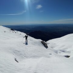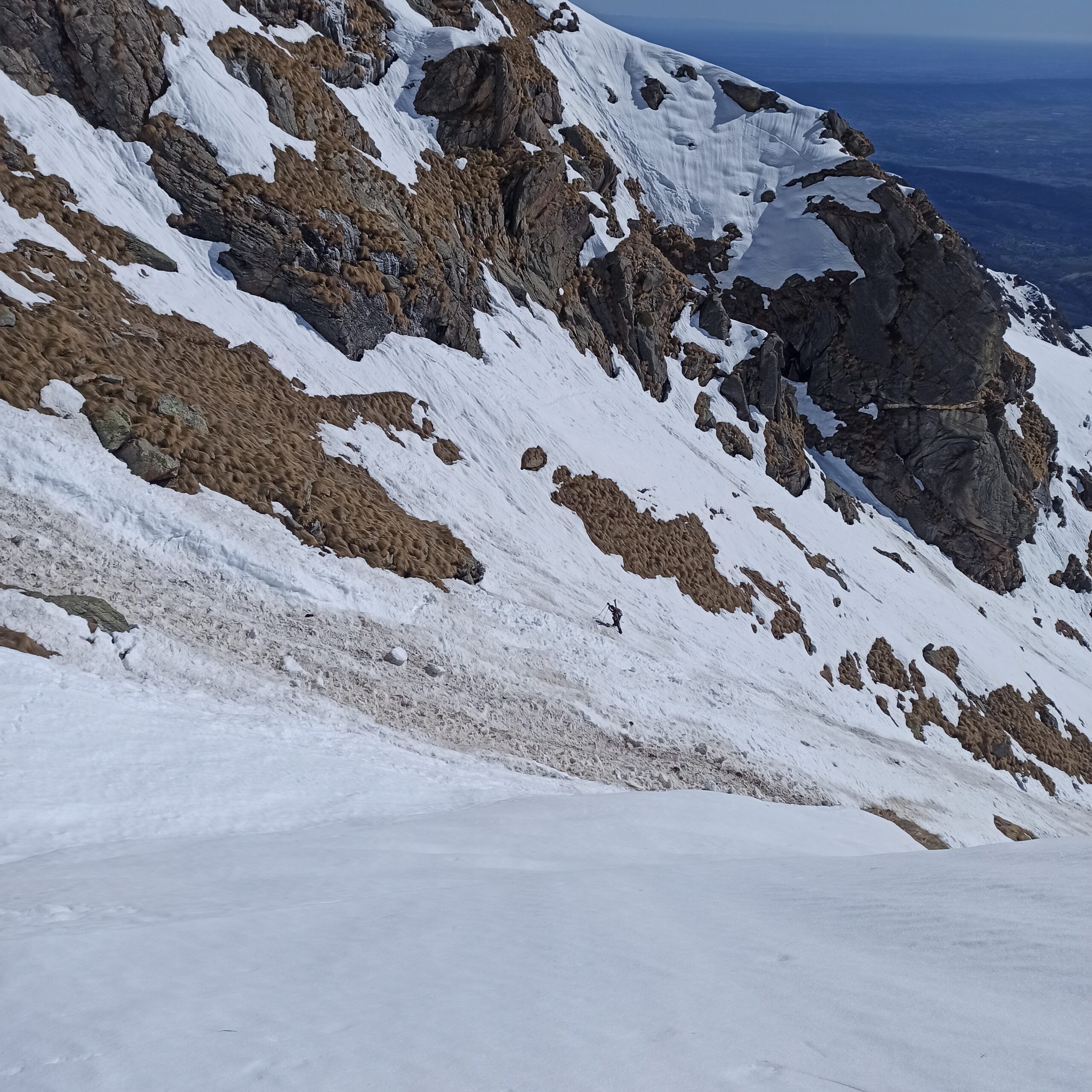 Partiti sci ai piedi da Pian delle Nere q. 1350 circa. Neve da subito molto dura, quindi sotto il Fornetto abbiamo direttamente messo i ramponi e sci a spalle, fino in vetta. Grossa slavina da attraversare nel canale sotto il rifugio, e qualche breve tratto ormai non più collegato .