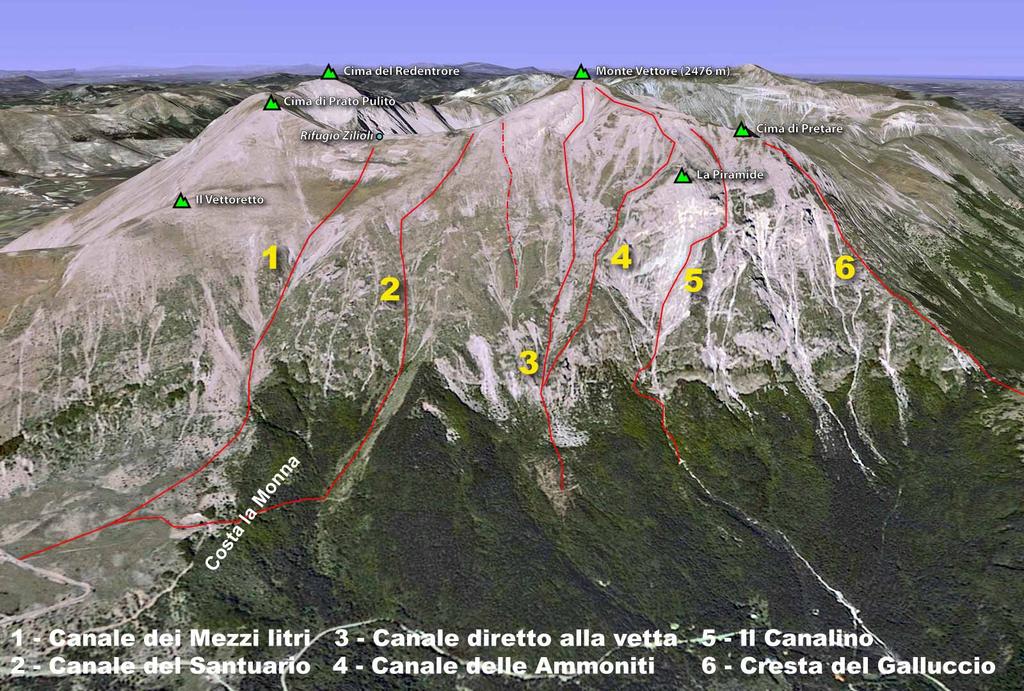 Dalla vetta del Vettore, salito per lo stesso canale o per la valle Santa o da Forca di Presta per il crestone percorso dal sentiero estivo, si scende all’anticima Sud (croce) e si affrontano i larghi pendii sul versante di Pretare puntando la casetta di presa dell’acquedotto.