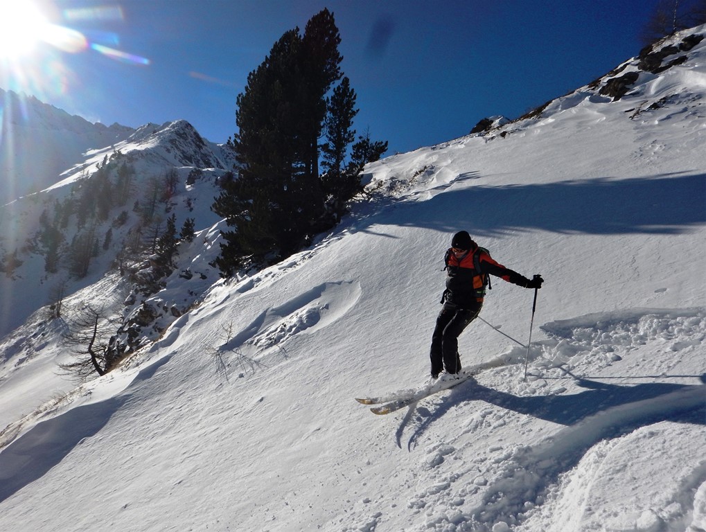 Neve migliore in basso che in alto, dove il vento di venerdì ne ha accumulata parecchia, addensandola. Pertanto discesa abbastanza impegnativa sino a metà, complice il tappeto di rododendri che se da un lato preservano le solette dall’altro ti fanno sciare come su una bolla d’aria… Meglio sotto, dove però, come scritto da Giorgio, il bosco diviene più fitto. Per contro ambiente davvero bello, con la breve dorsalina finale aerea e panoramica.
