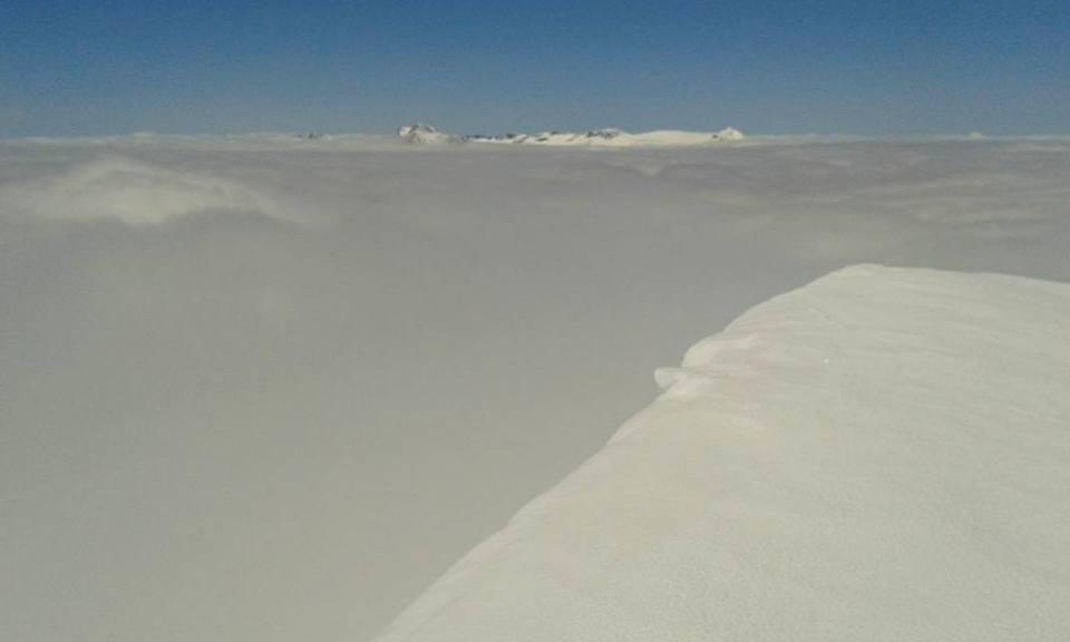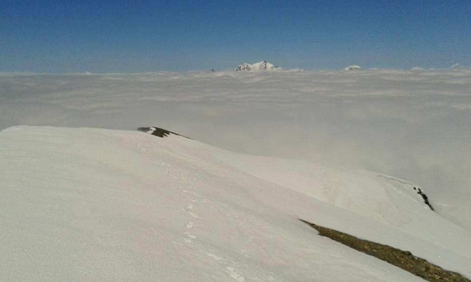 In discesa consigliata la traversata verso la roncia e la discesa per l’itinerario classico, in caso di cornici o neve inconsistente sulla cresta è possibile abbassarsi sul ghiacciaio presso il tratto pianeggiante della cresta, poco prima che diventi affilata. Il primo tratto è ripido e delicato con neve dura.