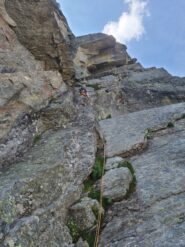 Roccia complessivamente abbastanza buona e arrampicata prevalentemente tecnica di piedi, tranne qualche breve risalto verticale; necessita la posa di protezioni veloci per assicurare gran parte della salita.