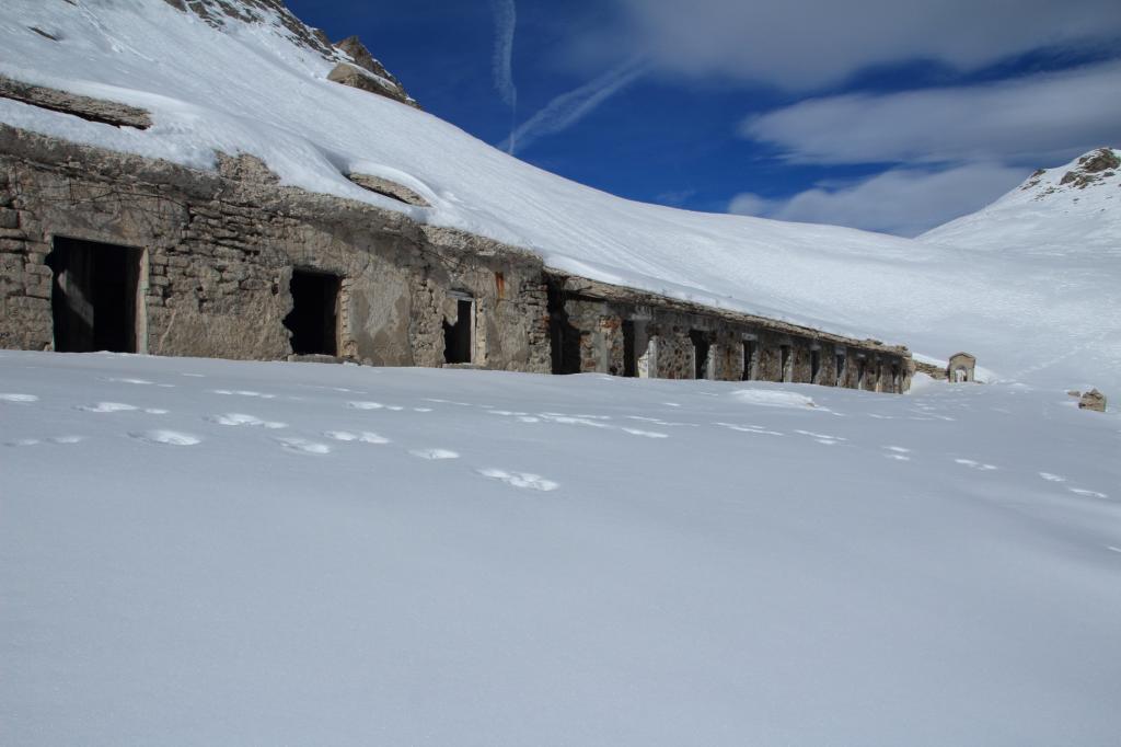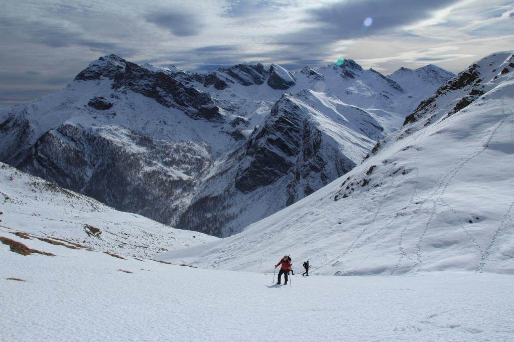Quando la pendenza si abbatte si entra nel vallone che adduce in fondo al Monte Ferra. Ci si mantiene al fondo sulla sinistra toccando in breve i ruderi delle Grange Reisassa 2385 m. Si lasciano sulla destra e poco dopo si inizia a salire a sinistra per un evidente valloncello, si supera un primo pendio un po’ più ripido che immette nella parte superiore; arrivati di fronte a un dosso lo si aggira indifferentemente a sinistra o destra e si arriva al colle di Reisasetto 2743 m (nelle vicinanze una grossa caserma).