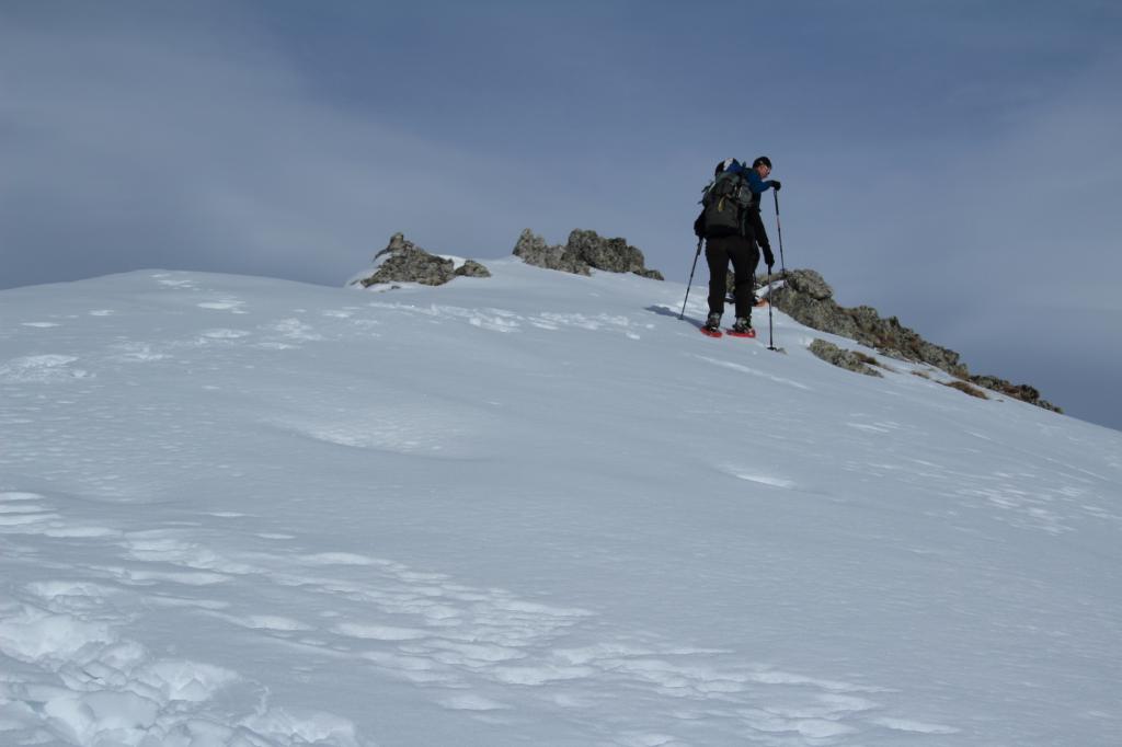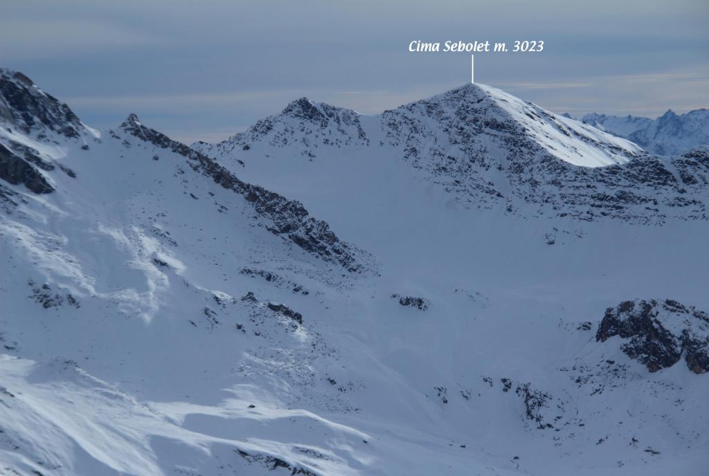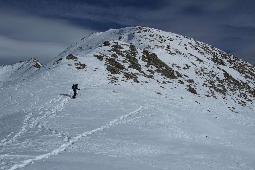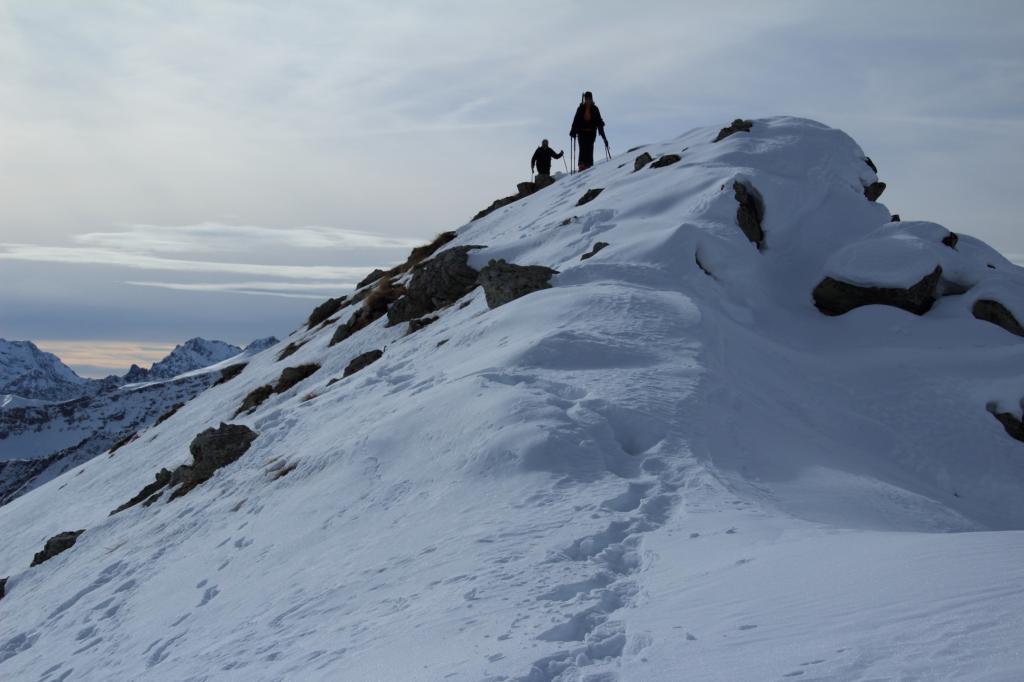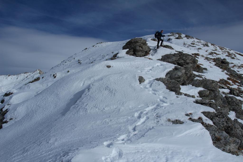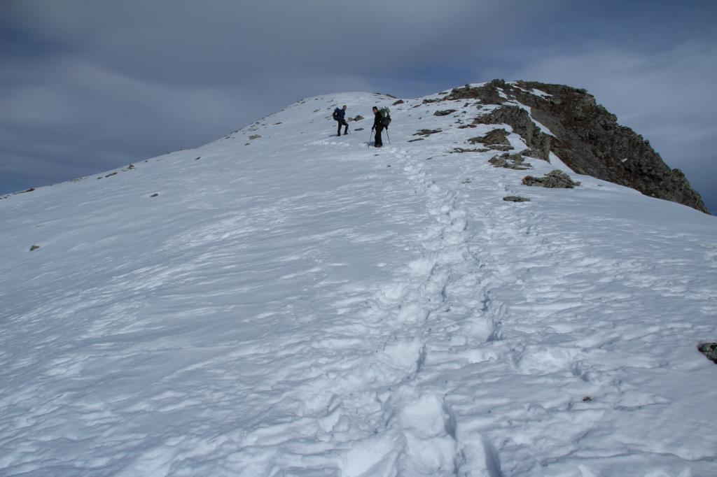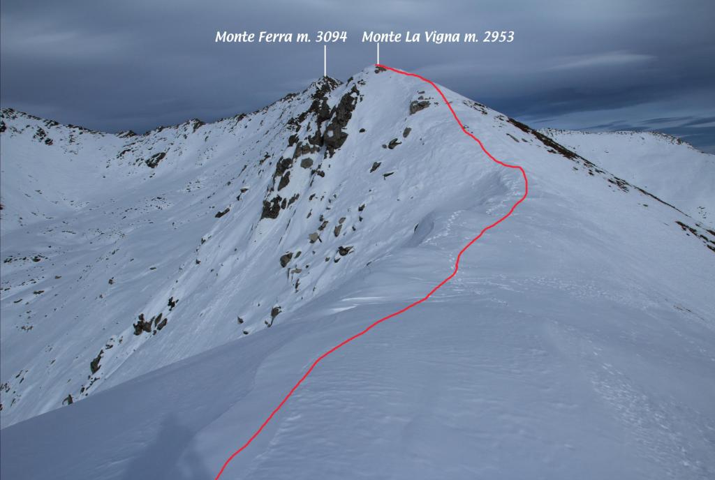 Si segue ora l’evidente dorsale S/SO, dapprima più stretta, poi superato un dosso diventa molto ampia e forma un bel pendio, che dopo un ripiano conduce alla dorsale sud, ormai in vista dell’anticima 2935 m caratterizzata da alcune roccette affioranti. Da qui si vede ormai chiaramente la cima; per raggiungerla occorre abbassarsi qualche metro sul versante sud-est (lato Vallone Reisassa) e percorrere la cresta sul filo con attenzione alle cornici sul lato Vallone di Rui e ad eventuali lastroni sul lato Reisassa. La cresta prosegue un breve tratto in piano, per poi salire più ripidamente i metri finali che conducono sulla stretta cima del Monte La Vigna. In base alle condizioni e all’innevamento, il tratto tra l’anticima e la cima può richiedere picca e ramponi, pur non presentando passaggi alpinistici.