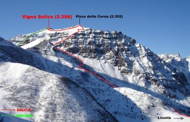 Dal parcheggio salire lungo le piste. Poco prima della stazione superiore della seggiovia, sotto la Cima Cavandola, iniziare ad attraversare a destra abbandonando le piste ed entrare nella Valgrande fino al Passo Valgrande (1.983). Da qui salire a destra lungo la cresta (o nel canale a seconda delle condizioni) che porta al Pizzo della Corna (2.352). Seguire il ripido crinale sino all’ampia dorsale terminale, attenzione alle cornici che escono sul versante nord-ovest, sino alla vetta della Vigna Soliva.