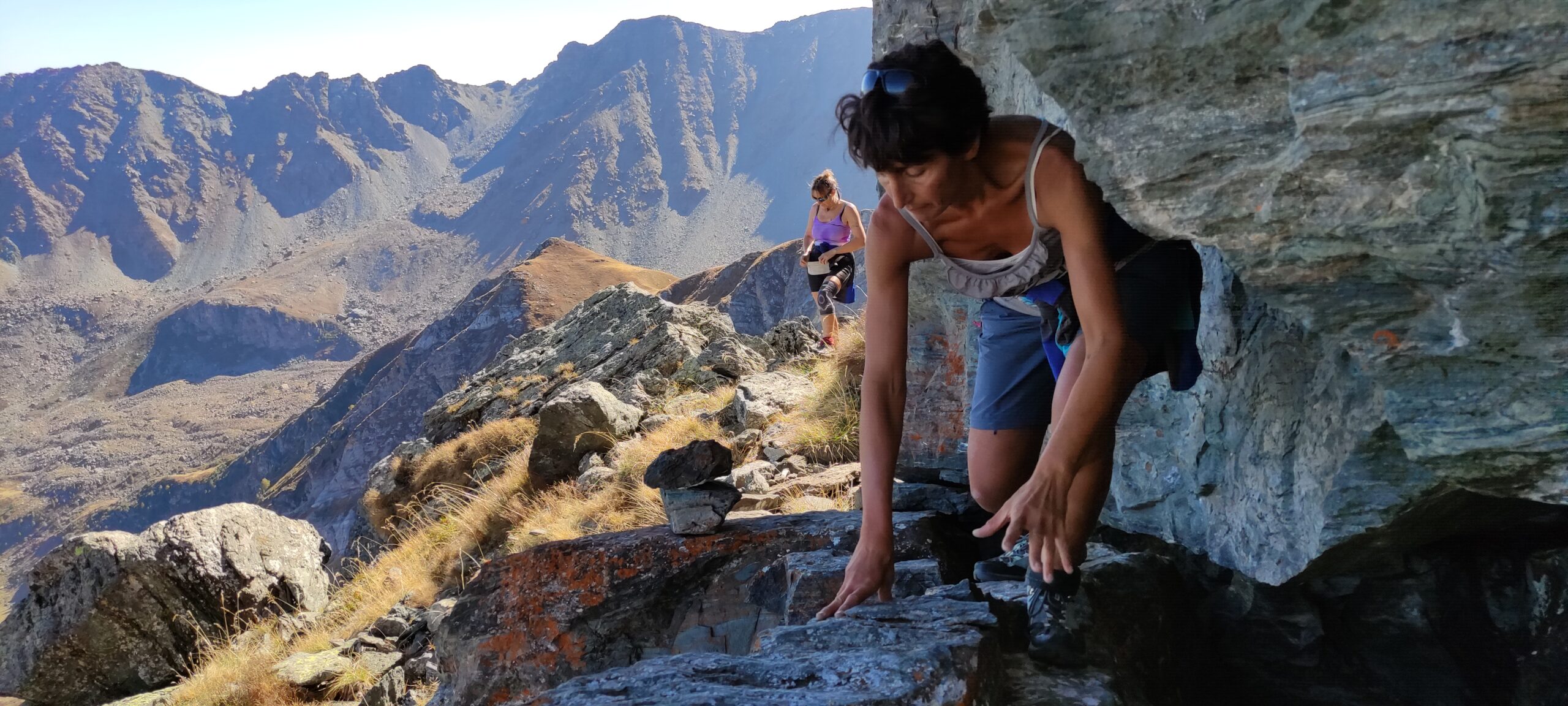 Sentiero ben tracciato fino alla Porta del Villano, da lì comunque una traccia evidente e qualche ometto portano fino in cima. Le difficoltà sono tutte dopo il colle, il ripido canalino, uno pseudo passo del gatto e le roccette finali, comunque su roccia buona.