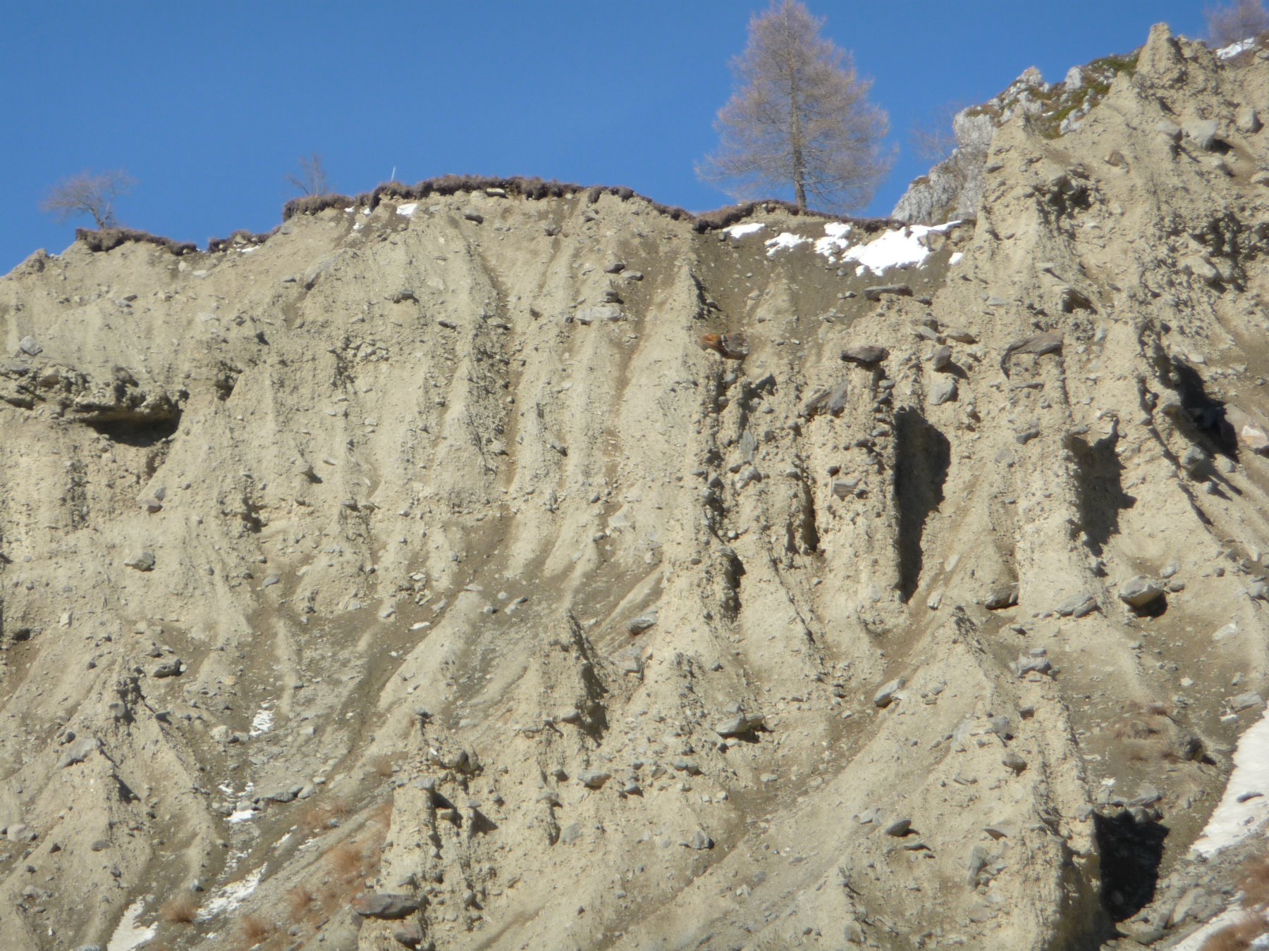 Qui si prende la ferita alla dx sulla sede di sfasciume che sta erodendo il fianco sabbioso del vallone, lo si risale, si recupera una barriera rocciosa in alto dove e si aprono ampi pendii che si affrontano a piacere con la meta davanti e la cima del Monte Savi leggermente a sinistra.