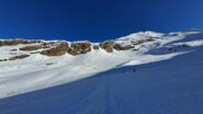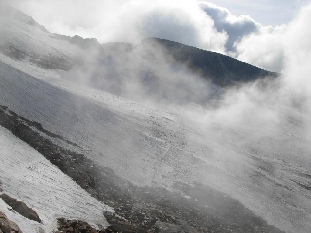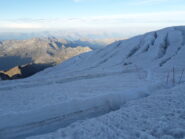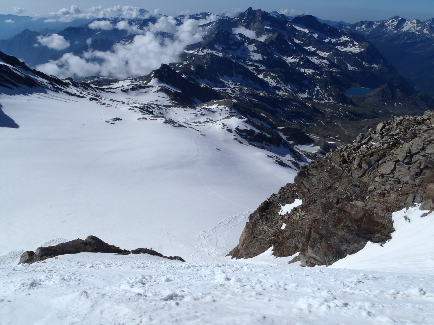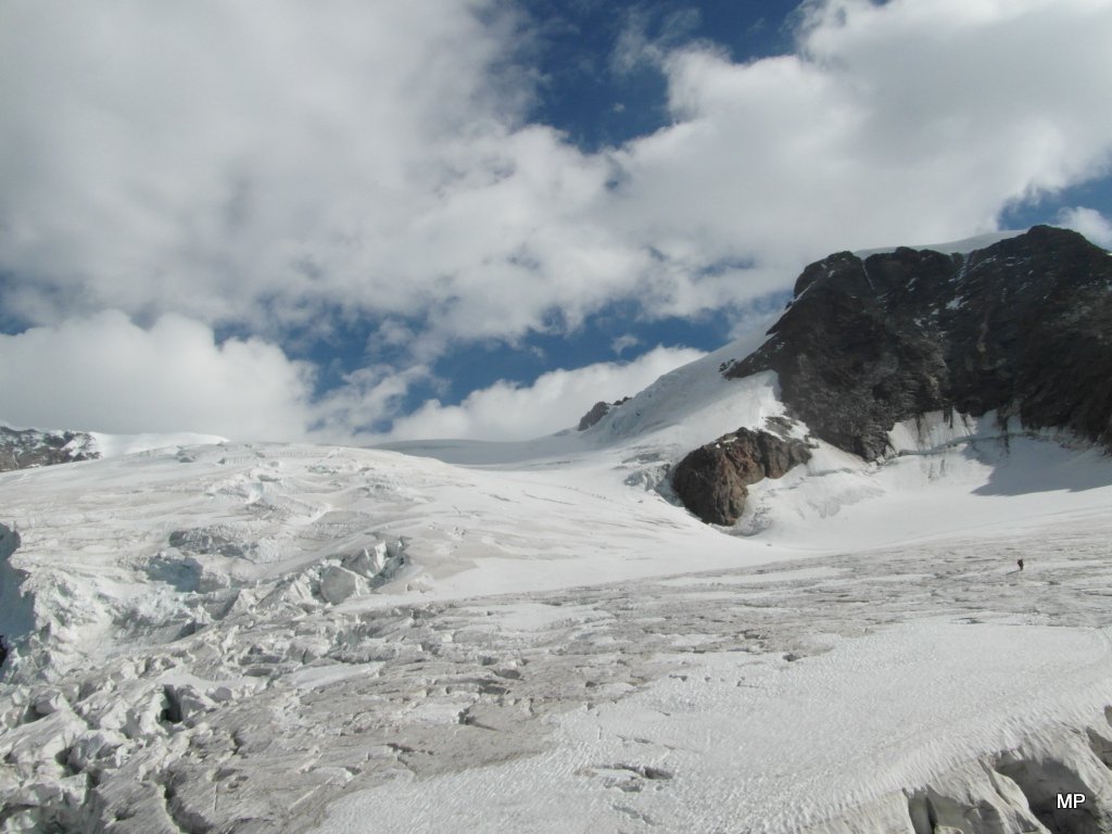 Il rientro, una volta ridisceso lo sperone roccioso avviene percorrendo un piccolo trotto di cresta e svoltando decisamente a sx scendendo per un lieve pendio sino ad incrociare la traccia che sale al colle del Lys e percorrendola verso valle si incrocia di li a poco la quota 4010 m (dove avevamo svoltato a dx per la Vincent) e si prosegue la discesa sino al Rifugio Mantova, e quindi a Punta Indren.