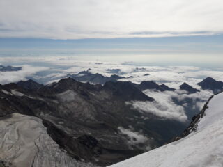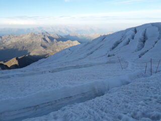 Dopo un anno ambiente irriconoscibile. Ghiacciaio di Indren in condizioni pietose, la parte di ghiaccio rimasta (il resto è un ravaneto) molto crepacciata in alto ed in basso palude. Alla Capanna Gnifetti si accede solo da dietro, davanti lo scioglimento del ghiacciaio non permette più di arrivare alle attrezzature. Dietro invece si entra in una gola stretta tra le rocce ed il ghiacciaio, dove è stata attrezzata una passerella di legno per raggiungere la scaletta di accesso. Salita da non sottovalutare allo stato attuale, fino al Colle Vincent dedalo infinito di crepacci, da aggirare, saltare od attraversare su ponti non sempre convincenti per affidabilità. Ed infatti essendo un po’ tardi non siamo andati al Cristo delle Vette nonostante la giornata non calda. Traccia sempre visibile, anche nelle zone di ghiaccio vivo, e molti paletti rossi per indicare il percorso giusto nel labirinto. Un crepaccio largo un metro anche in vetta.