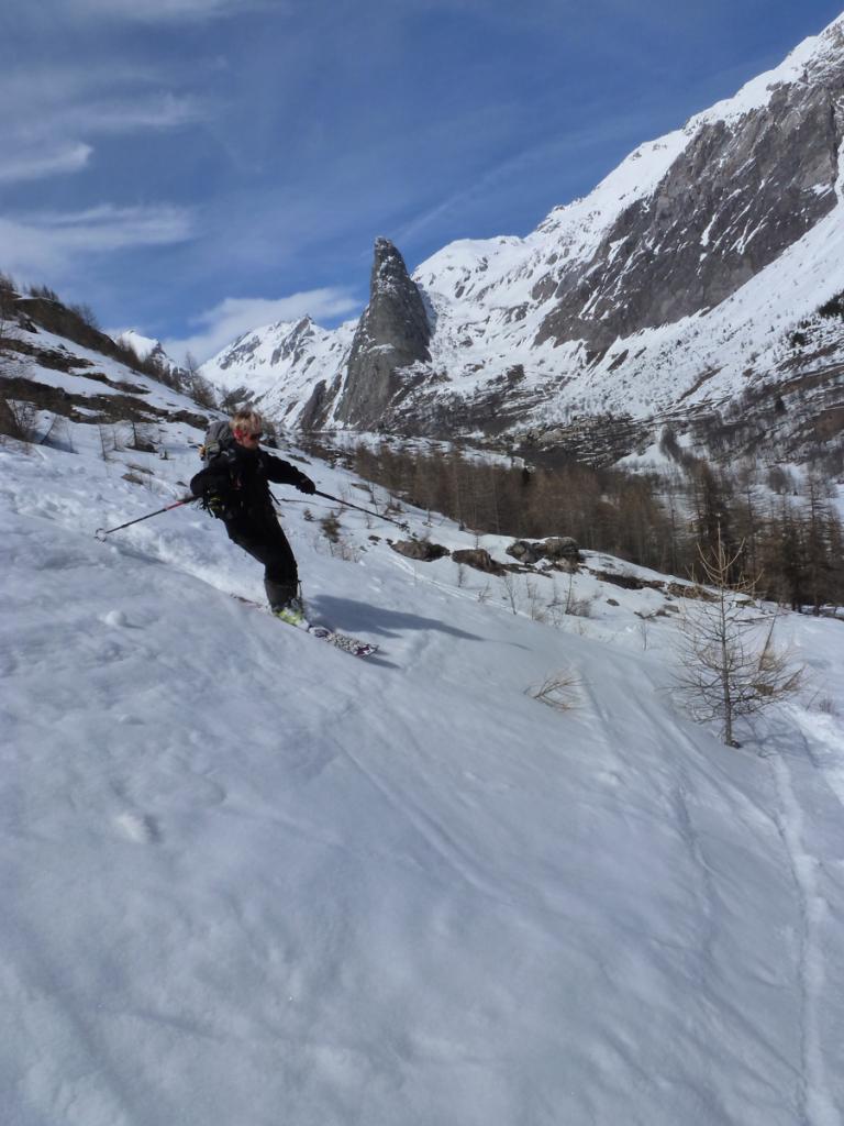Discesa lungo la cresta su neve gelata; dal colle in giù fino a 1900 su polvere più o meno compressa; parte bassa uniformemente molle.