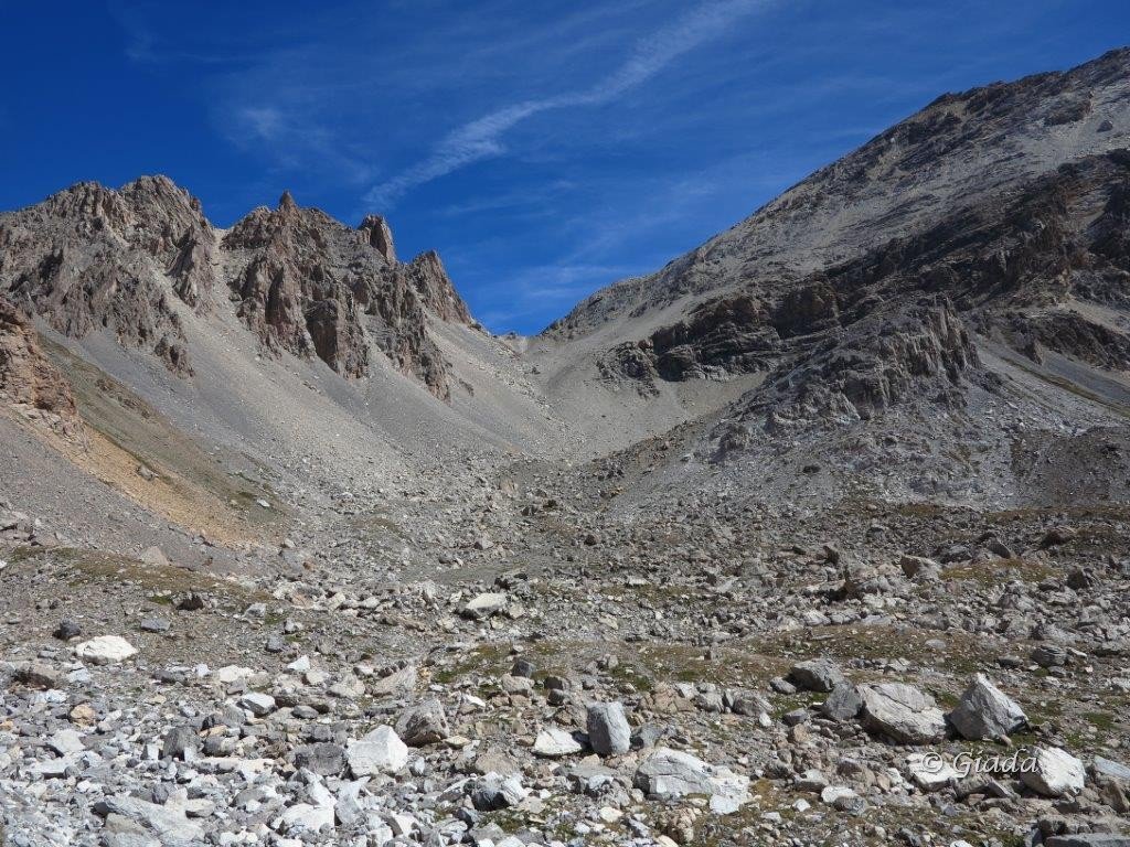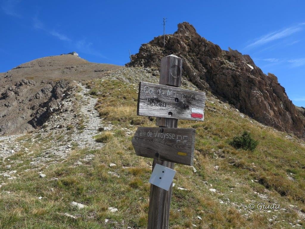 Dalla presa dell’acqua/serbatoio a quota m.1750 circa, a monte del piazzale, sulla sinistra parte il sentiero, palina con le indicazioni, seguire il sentiero lasciando a sinistra i bivi per il Col de Mallemort, GR5-56, da dove scenderemo e tenere sempre la destra inoltrandosi nel vallone del Rio de La Rouchose, passando una presa dell’acqua e le paline illustrative della storia della seconda guerra. Si lascia poi a destra il bivio per il Col de La Gipiere de L’Oronaye e l’altopiano prativo de La Montagnette, palina, e si prosegue in salita a sinistra. Si arriva ad un grosso ometto dove la vista si apre sull’aspro altipiano ornato da ardite guglie, tra la Tete de Viraysse e La Meyna a sinistra e la cresta che da La Cime de La Coste du Col culmina sul Monte Sautron a destra, mentre a destra abbiamo il vasto altopiano erboso verso il Col de La Gipiere de L’Oronaye e il Colle delle Munie, per i francesi Col De Monges, e La Cabane de Viraysse. Si passa il Lac de Viraysse ed altri due laghetti, nei pressi dei quali si lascia il sentiero per il Col Sautron a destra e si devia a sinistra per un costone tra erba e pietre, traccia, fino ad innestarci sul sentiero che proviene dal Col Sautron, segnavia del Tour du Chambeyron, e va verso il Col de La Portiolette. Lo si segue verso sinistra fino al Col De La Portiolette m. 2692, dal colle si scende sull’altro versante aggirando a nord la Meyna, su sentiero ripido e traccia, recenti frane hanno portato via parte del sentiero, si scende nel vallone du Vallonnet – Pinet. Senza scendere sul sentiero basso del Vallonnet, a quota m. 2470 circa, si trova a sinistra una traccia/sentiero, segnavia giallo, che più o meno rimanendo in quota taglia il fianco ovest della Meyna per arrivare ai Baraquements de Viraysse m.2503 dove arriva una strada sterrata da St-Ours. Si prosegue a lato delle vecchie caserme, aperte, sulla mulattiera che sale al Col de Mallemort m.2558. Dal colle si prosegue a sinistra sulla mulattiera, tagliole, fino alla panoramicissima Tete de Viraysse m. 2772 che ospita il vecchio forte della Batterie de Viraysse che domina la valle, un vero impressionante Nido d’Aquila. Imponente e meravigliosa la Meyna vista da qua. Il bel forte al momento è chiuso, la vista da qui è meravigliosa su un paesaggio mozzafiato.