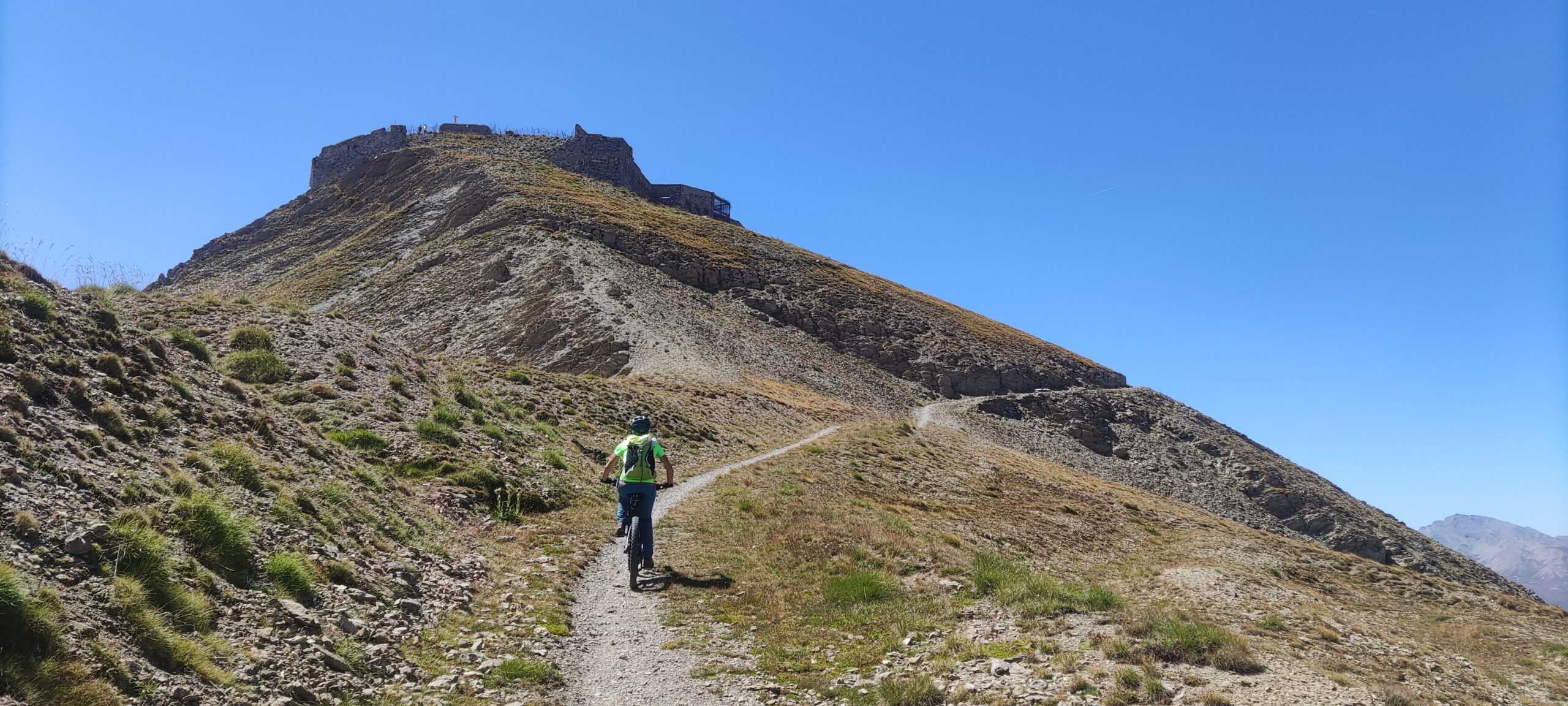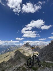 Qui è d’obbligo la sosta per ammirare l’ampio panorama che si apre sulle tante vette presenti in zona! Ora ci manca un ultimo strappo per arrivare alla cima a quota 2772 m, lo affrontiamo sempre in sella raggiungendo il piccolo piazzale adiacente all’ingresso del forte che occupa la cima intera. Purtroppo a causa del pericolo di crollo il cancello è chiuso ed è impossibile entrare all’interno e raggiungere quindi la vera cima.