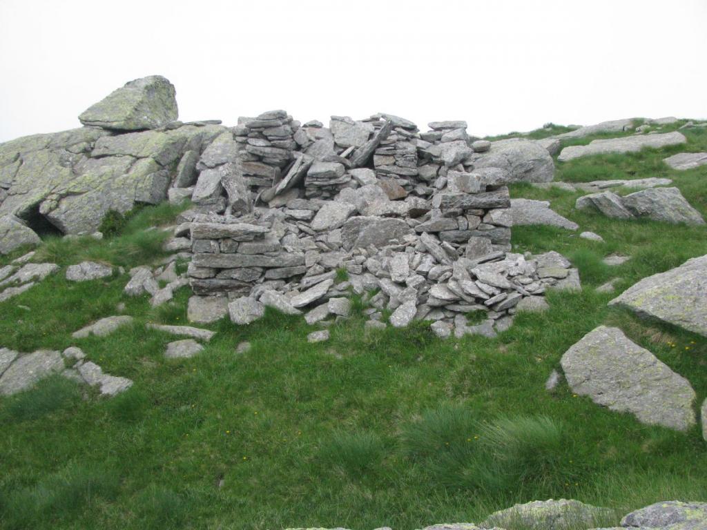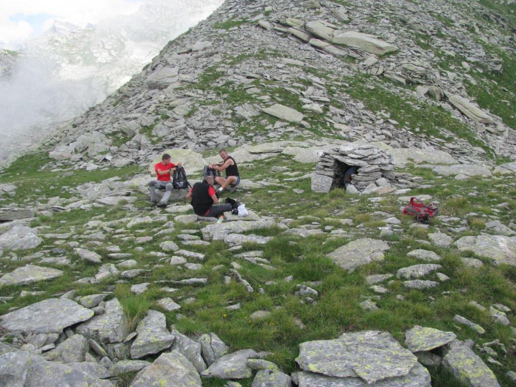 Salire sul retro della baita su delle zolle erbose che risalgono fra piccole formazioni rocciose giungendo ad un piccolo piano ai piedi di una pietraia.