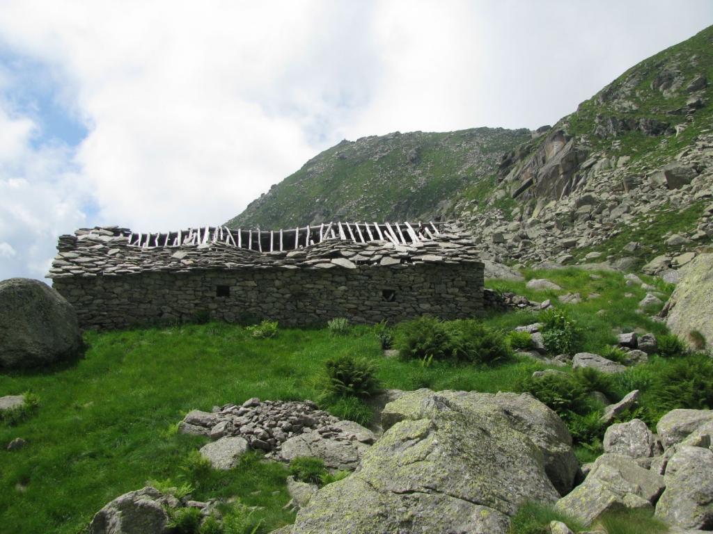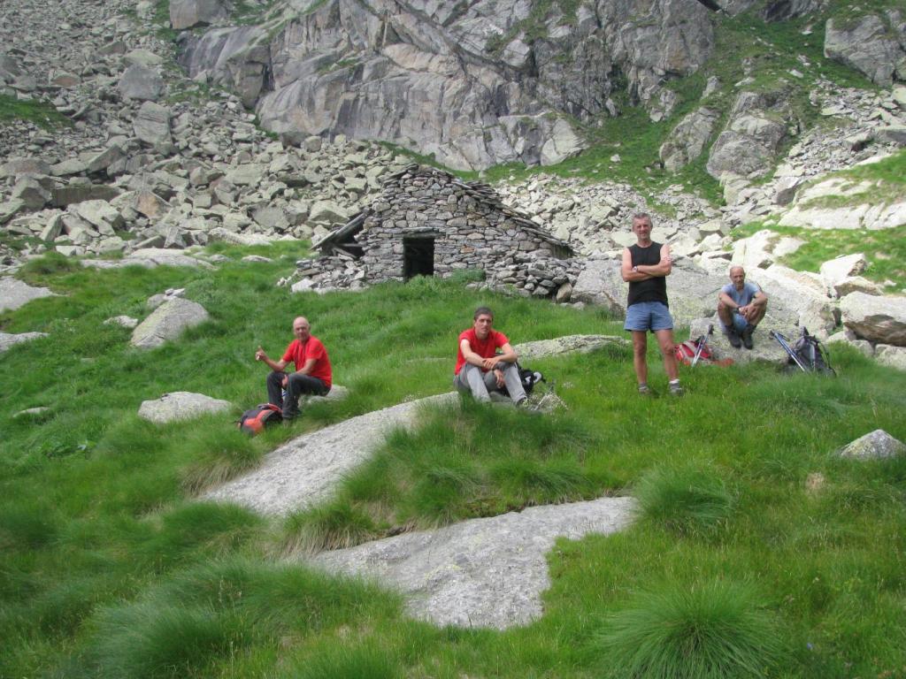 Proseguire, stessa direzione, superando un paio di piccole gibbosità si perviene al piano superiore della Muanda; percorrerlo in leggera discesa prima e leggera salita dopo, primi ometti, giungendo in fondo del piano. Piegare a destra, seguendo gli ometti si sale un fascia parzialmente erbosa, di fianco ad una pietraia, poi piegare a sinistra alla base delle roccette si giunge ad un minuscolo praticello fra le pietraie; davanti un dosso roccioso, dove sopra si scorge la baita dell’Alpe Terrin. Superare un breve tratto di pietraia e superare a destra il dosso giungendo alla baita.