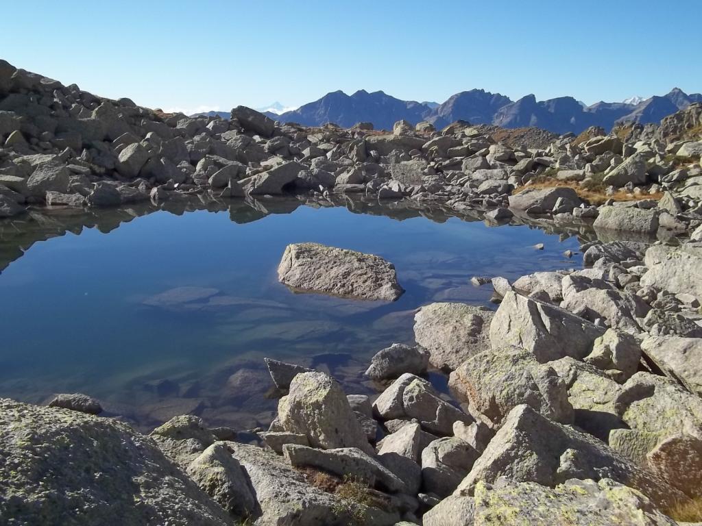 Qui si incrocia il segnavia bianco-rosso AVC proveniente dal Vallone di Praghetta. Seguire i segnavia che con alcuni saliscendi ci portano al di sopra della piccola conca erbosa alla base del Passo Destrera.Senza scendere nella conca si abbandona il sentiero segnato e si sale a dx raggiungendo poco piu’ in alto una conca con piccolo laghetto.