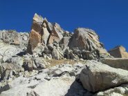 Piegare a destra attraversare un piccolo tratto di pietraia e salire il versante erboso fin quasi contro le rocce.