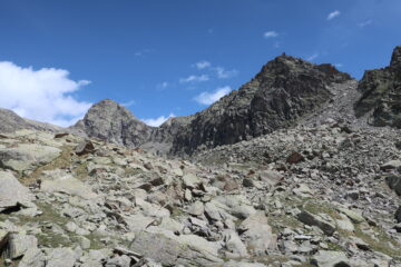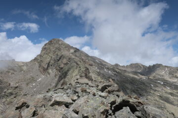Una volta arrivati al laghetto senza nome, il canale per arrivare al colletto è piuttosto evidente. Dal colle alla punta, in salita abbiamo aggirato il grosso roccione rosso sulla cresta a sinistra. Al ritorno ci siamo tenuti sul versante opposto (quello del lago Nero), dove il terreno è più semplice, per poi attraversare senza difficoltà la cresta poche decine di metri sopra il passo (in salita questo passaggio non è ben visibile).