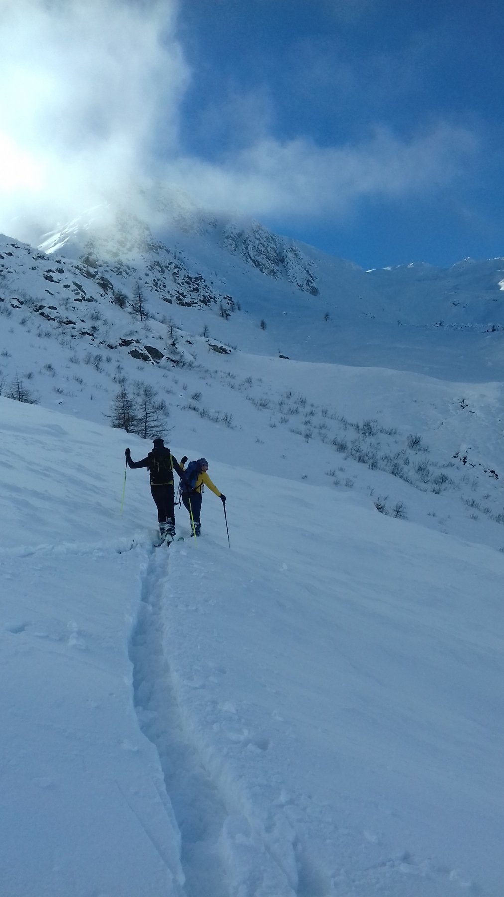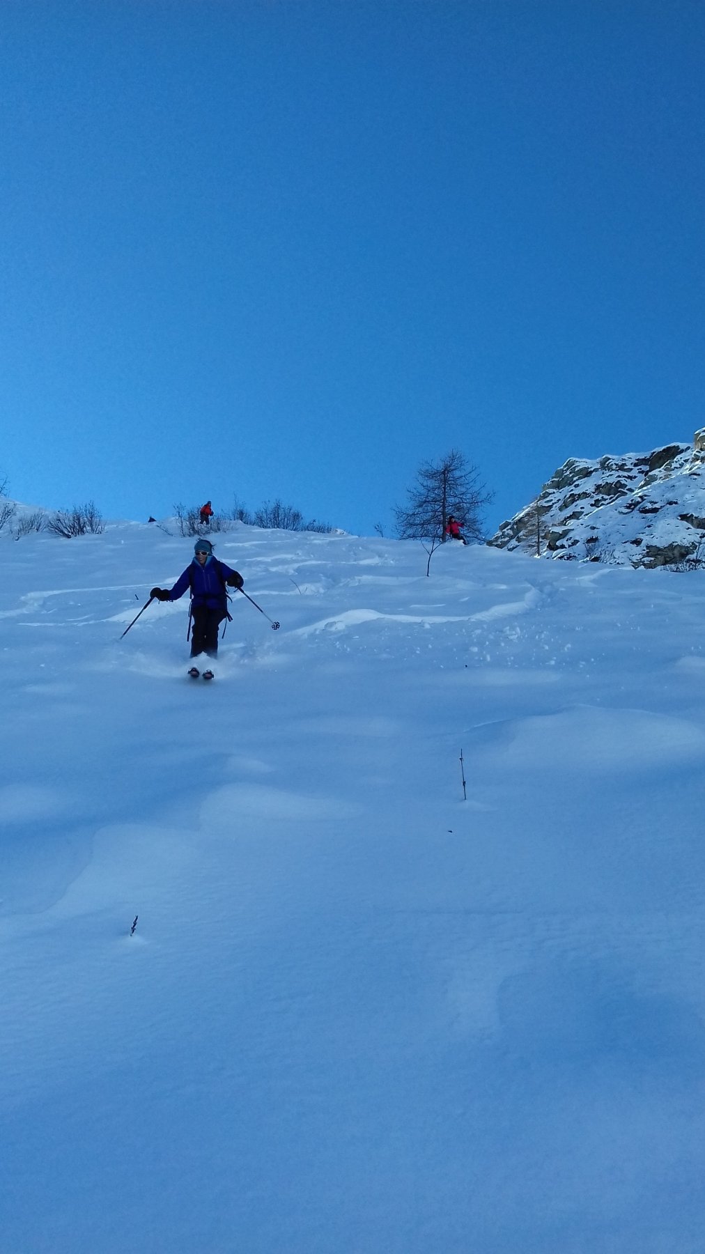 Prima parte di discesa molto bella, farina un pò pesante ma sciabile mentre la parte centrale nonostante il buon innevamento si è rivelata decisamente ostica tra arbusti e rocce affioranti. Meglio l’ultimo tratto sui prati anche se la neve lì era decisamente pesante.