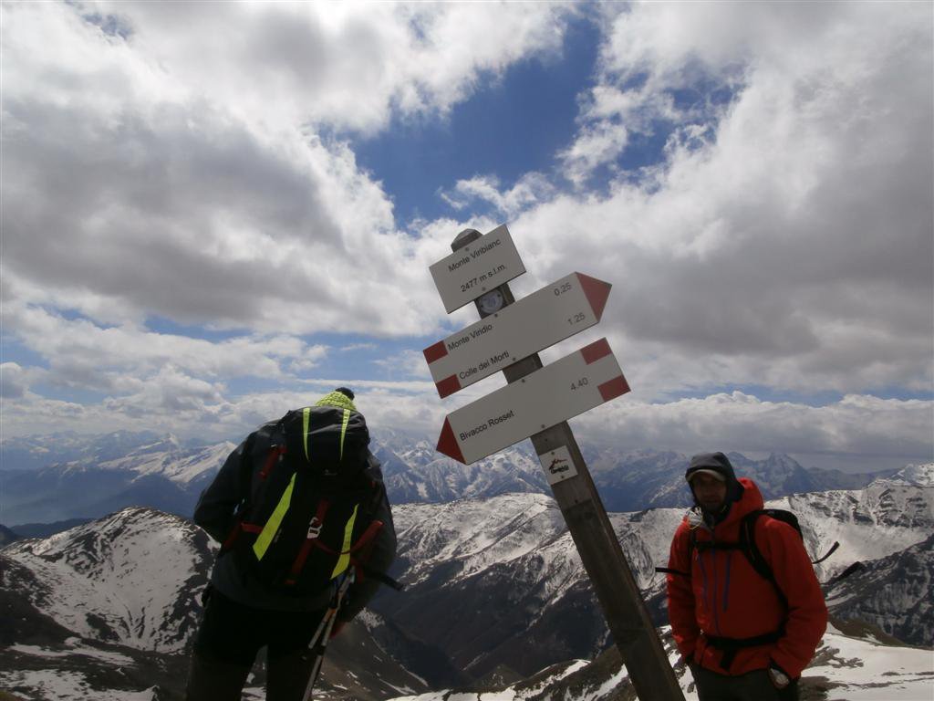 Visto il gran vento e la nuvolaglia abbiamo preferito lasciare l’auto a S.Giacomo, risalire nella comba più riparata e senza neve fino alla Pera Puntua. Da qui traverso verso il colle Viribianc (qualche lingua di neve da traversare, anche senza ramponi, oramai) e la bella cresta dei Mulets, breve discesa al colle omonimo e risalita sul Viribianc (optato per il breve e semplice canalino tra le 2 cime). Gran vento oggi, e soddisfatti del giro scendiamo velocemente verso il sottostante rifugio già aperto nei fine settimana: merita la sosta; infine la parte più noiosa è stata scendere fino a S.Giacomo a riprendere l’auto. Oggi con Giorgio, Davide e Maycol.
