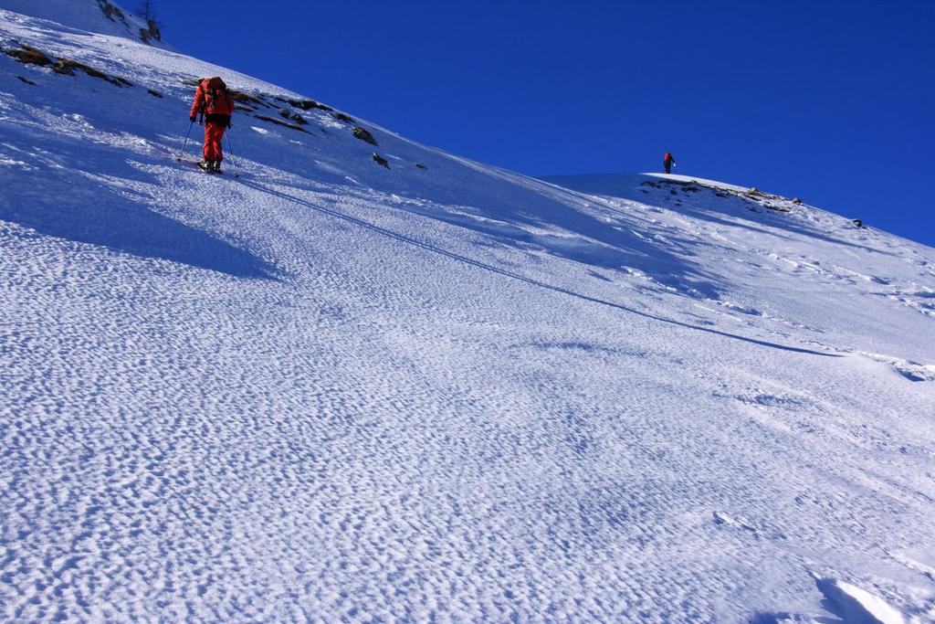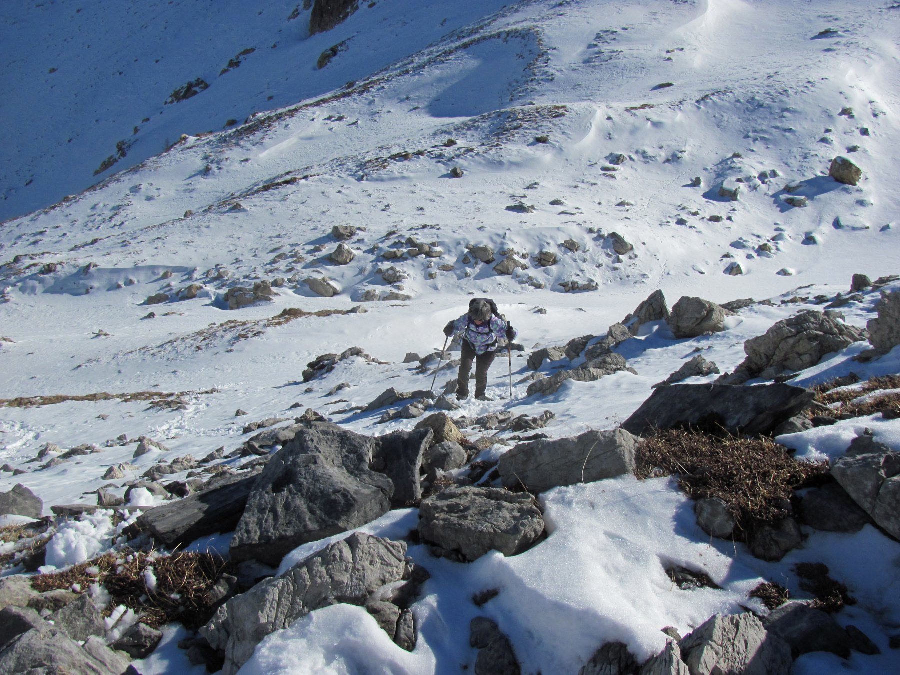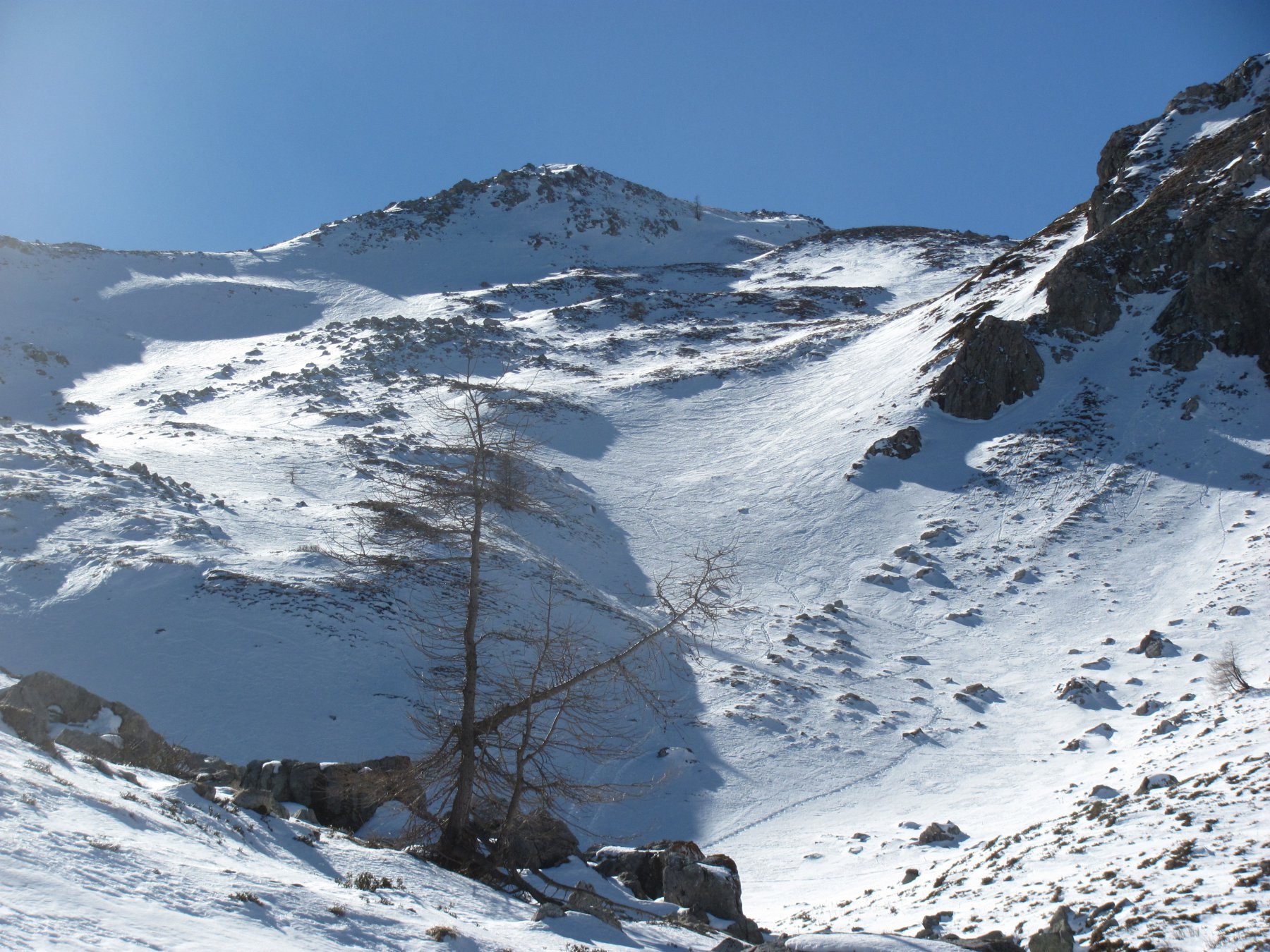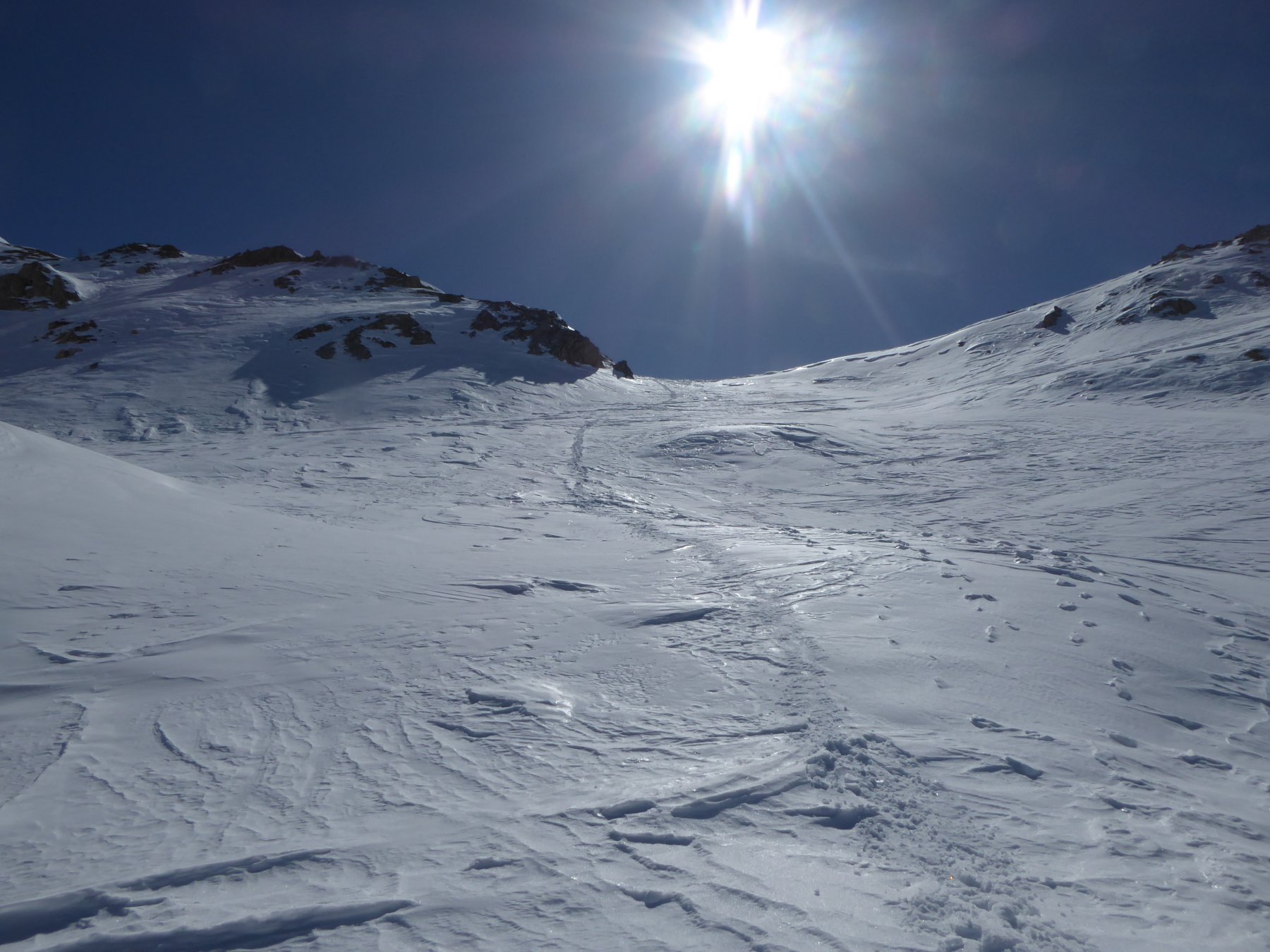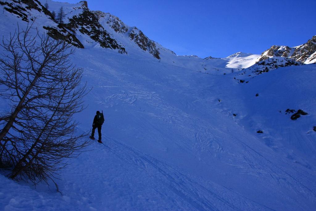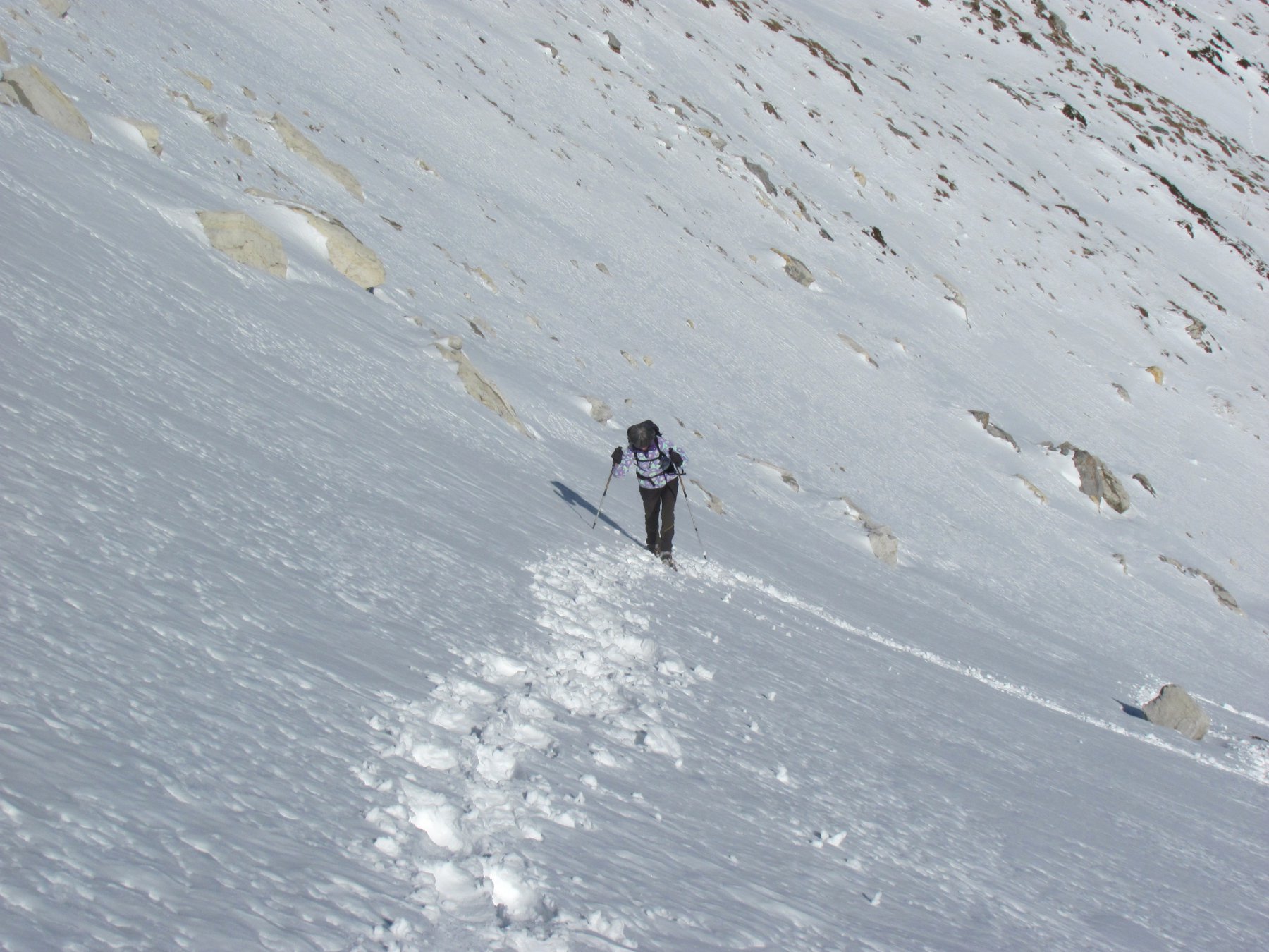 Il vallone di salita richiede neve sicura, perchè si svolge su tratti piuttosto ripidi ed altri incassati sotto pendii soggetti a scariche. In buone condizioni di neve non serve attrezzatura aggiuntiva, eventualmente i ramponi al seguito per i tratti più ripidi.
