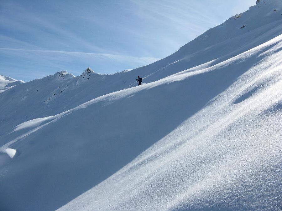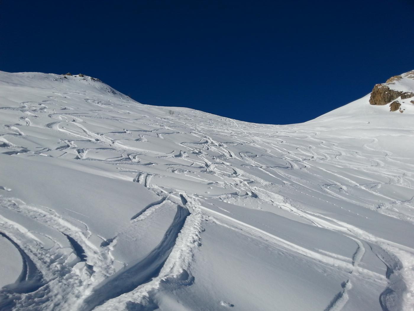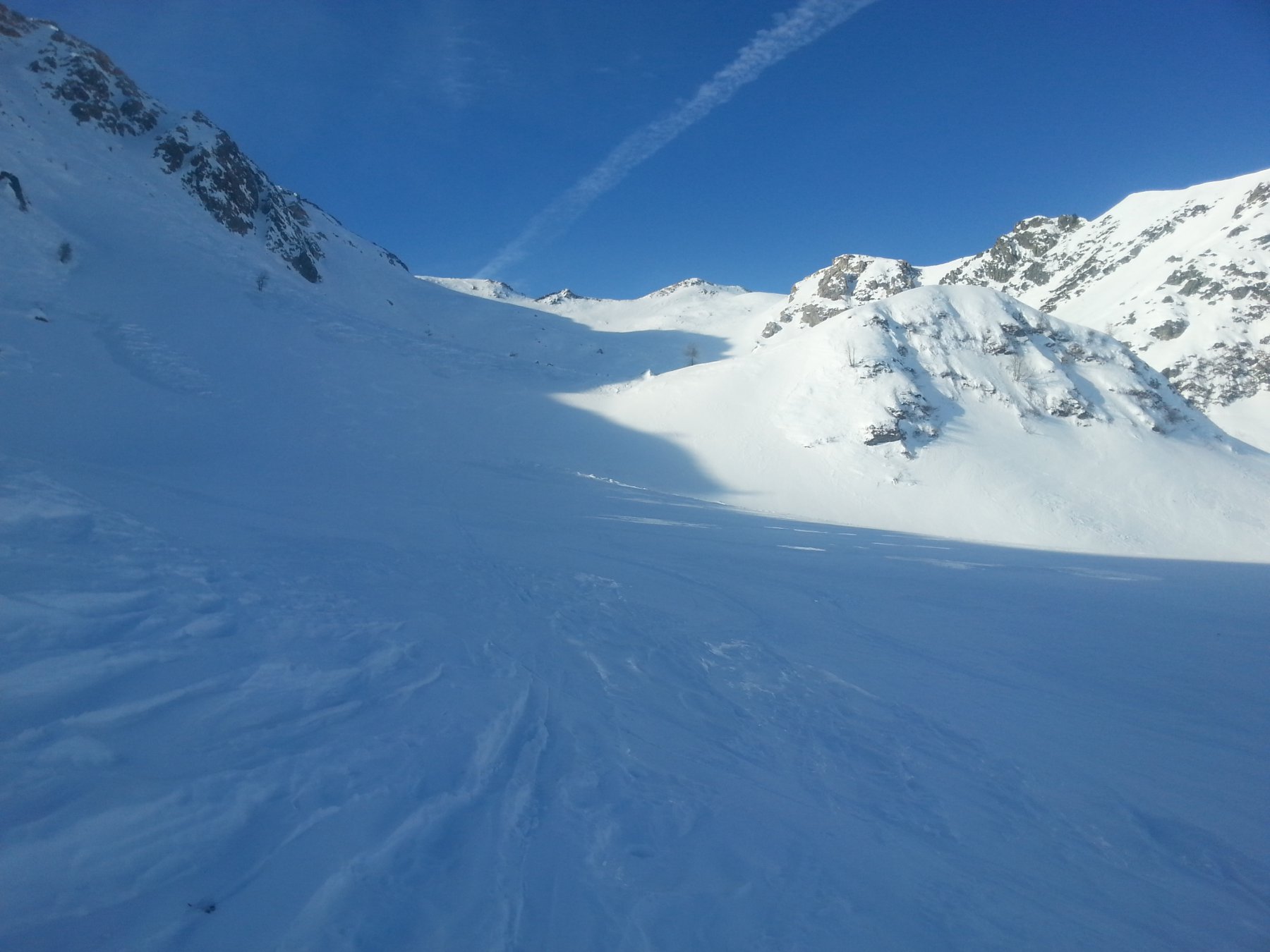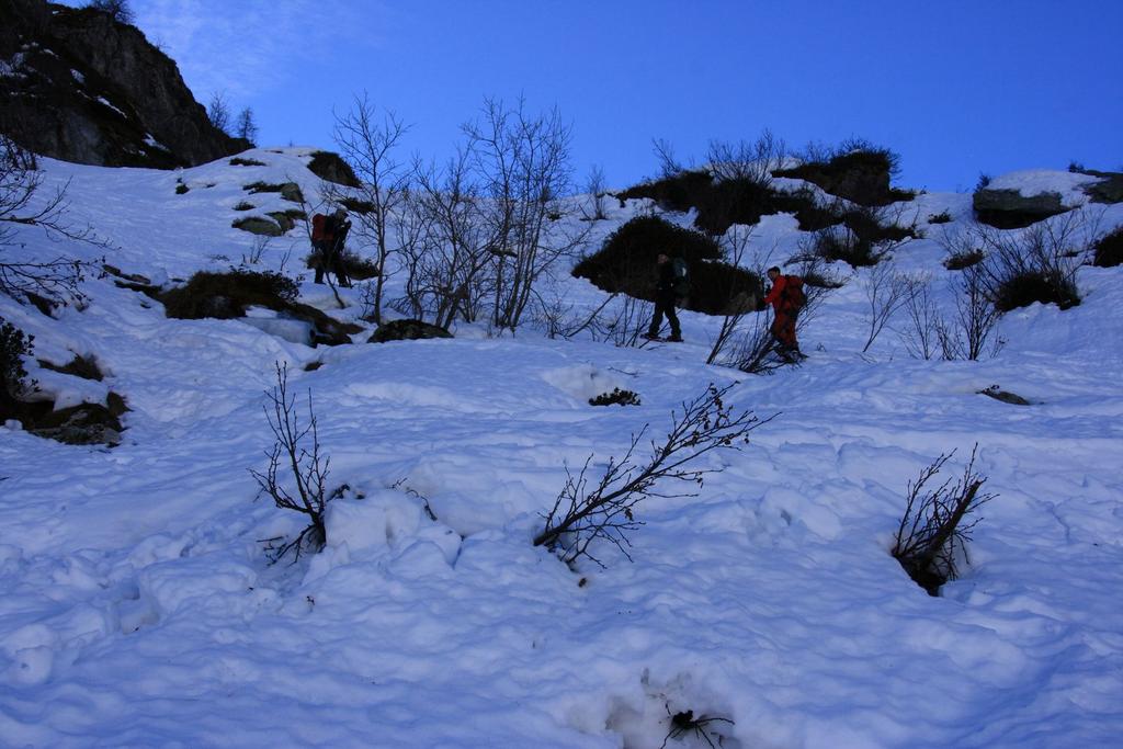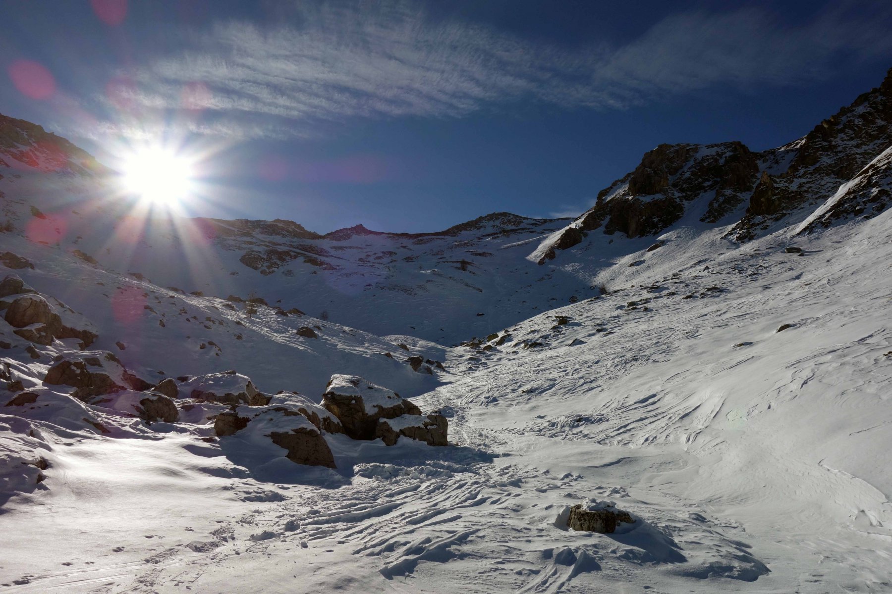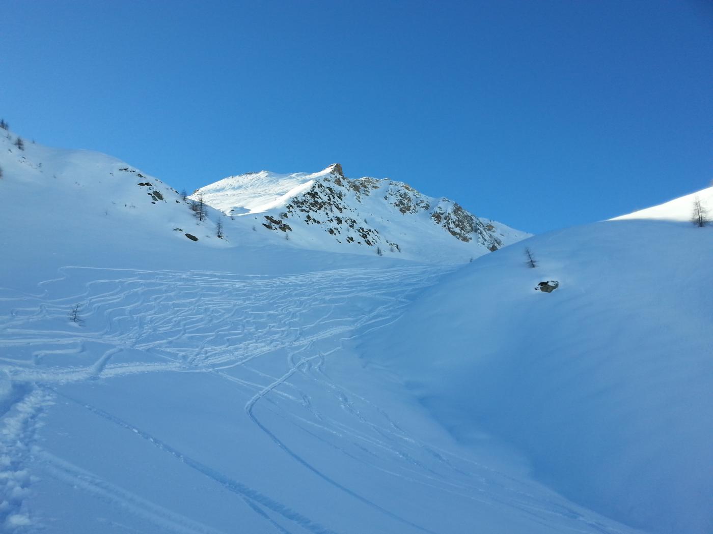 Il vallone di salita richiede neve sicura, perchè si svolge su tratti piuttosto ripidi ed altri incassati sotto pendii soggetti a scariche. In buone condizioni di neve non serve attrezzatura aggiuntiva, eventualmente i ramponi al seguito per i tratti più ripidi.