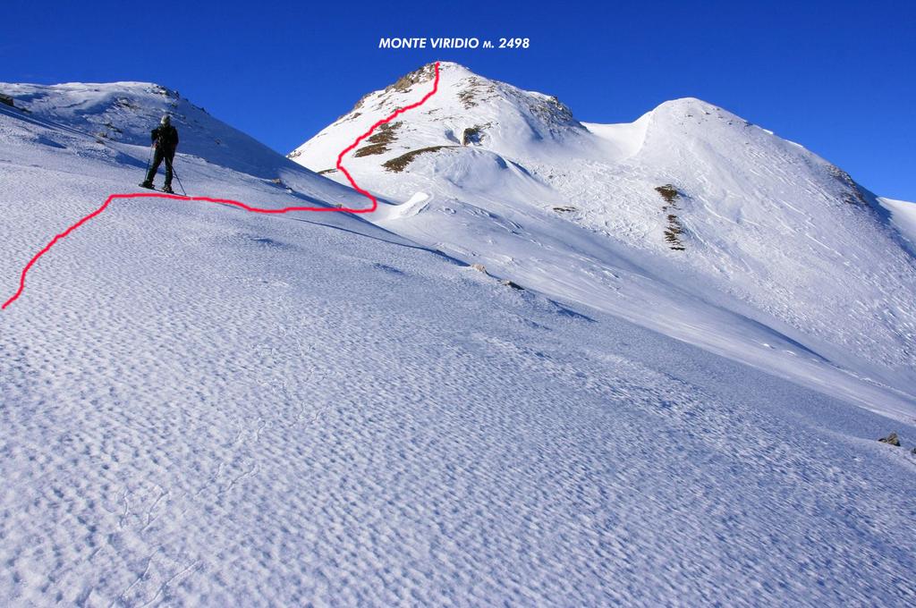 Si risale il vallone tenendosi al centro e poi volgendo verso destra (qui si trova un breve ripiano per rifiatare) e quindi si riprende a salire un bel pendio di pendenza sostenuta, passando sotto al Monte Viribianc ed al suo canalino nord, giungendo ad un colletto dal quale finalmente si vede la cima del Monte Viridio.