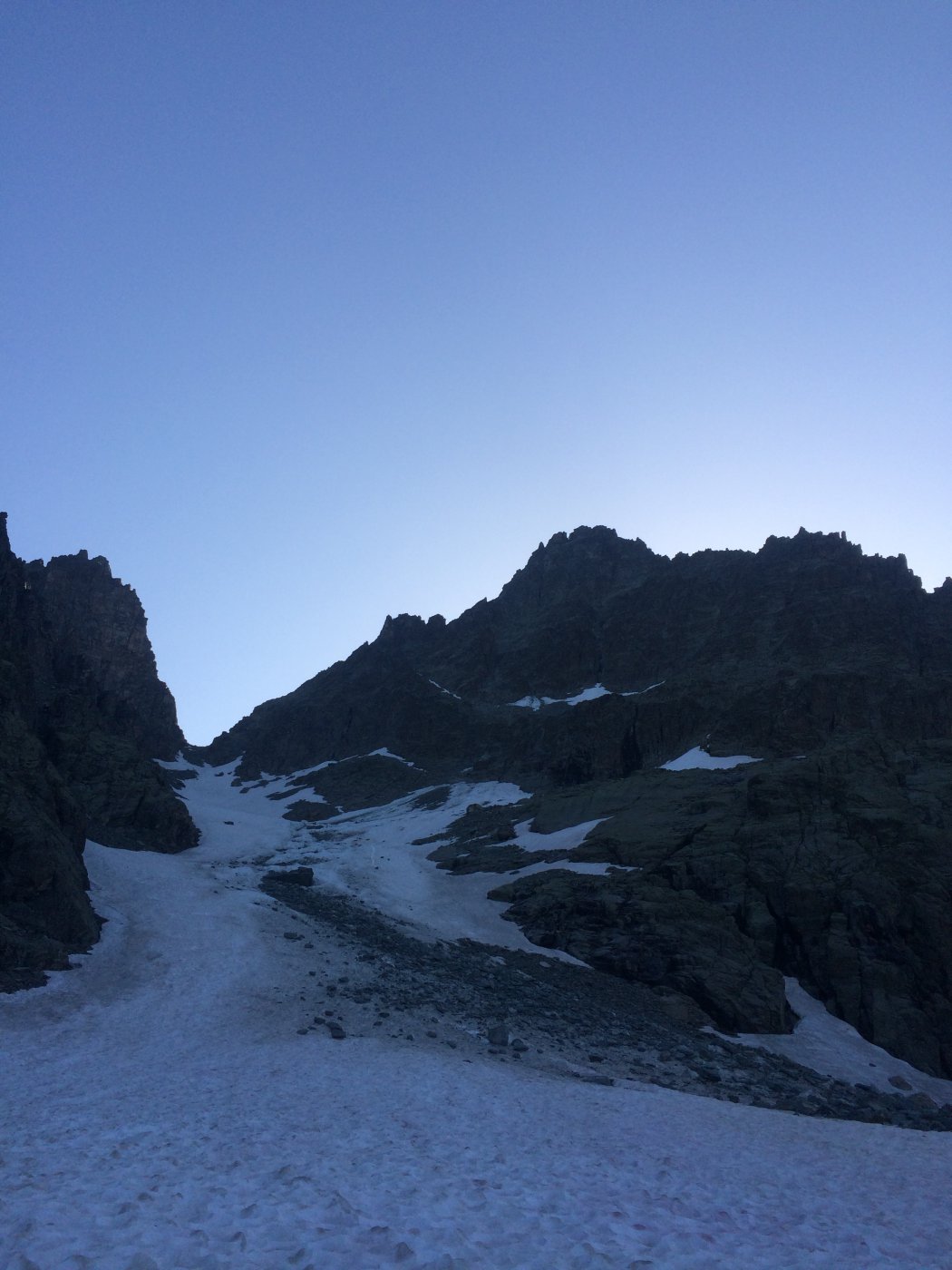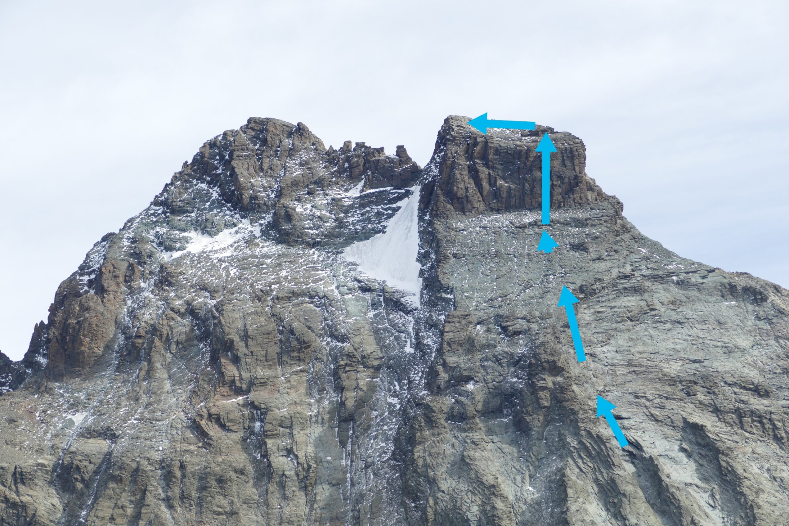 Nella parte superiore, verso i 3500 m circa, poco a sx del filo di cresta, si giunge ad una placca inclinata sormontata da una barra rocciosa verticale.