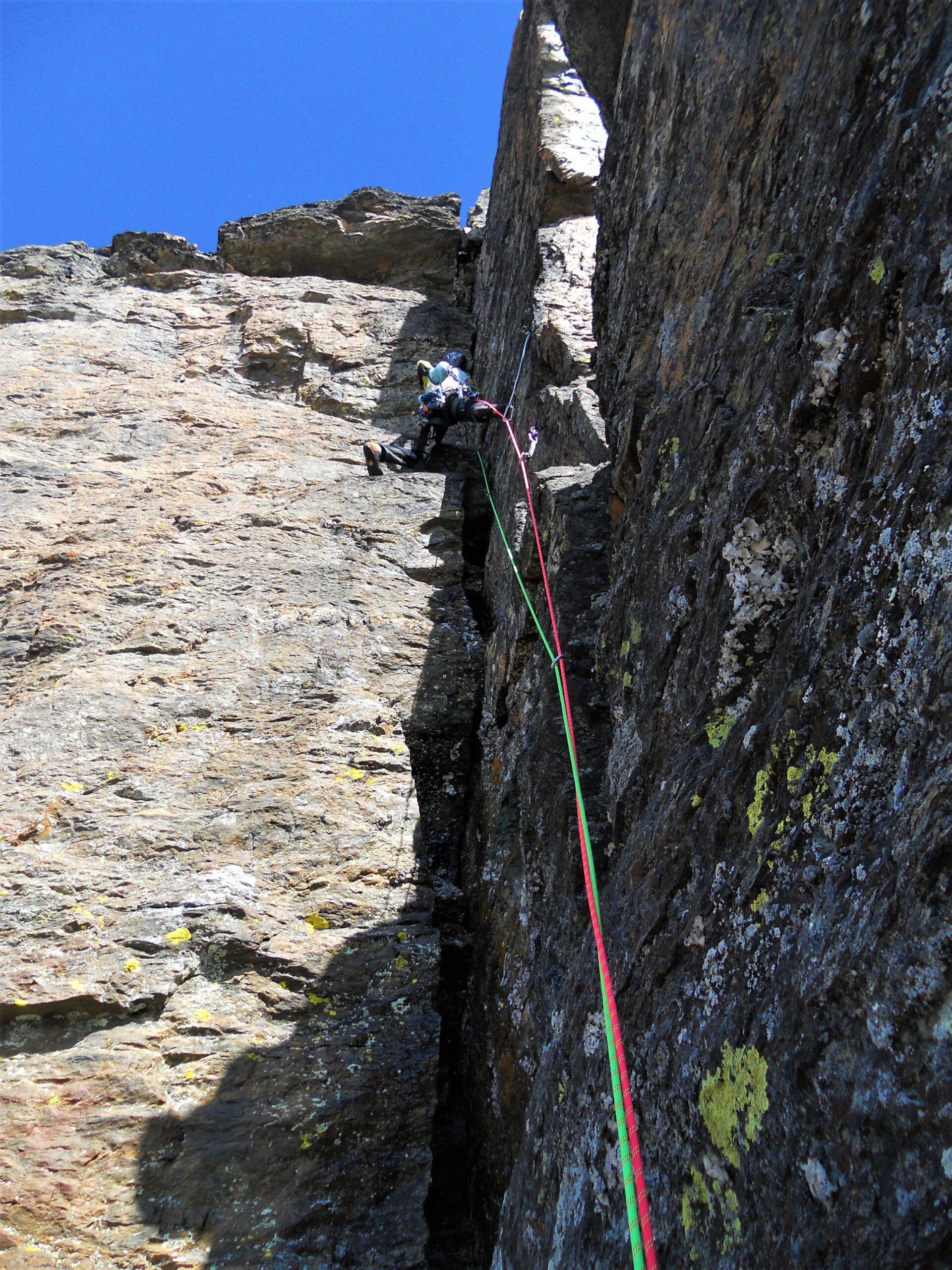 - L2) Si attacca il diedro bagnato salendo una fessura sulla faccia a dx fino ad un gradino. Si traversa a sx nel diedro e si sale la fessura di fondo fin sotto lo strapiombo che ne chiude l’uscita. Se ne esce a dx sfruttando delicatamente dei blocchi incastrati per sostare poi, rientrati a sx, nella profonda spaccatura ( V+/VI, passo VI+, 20m).