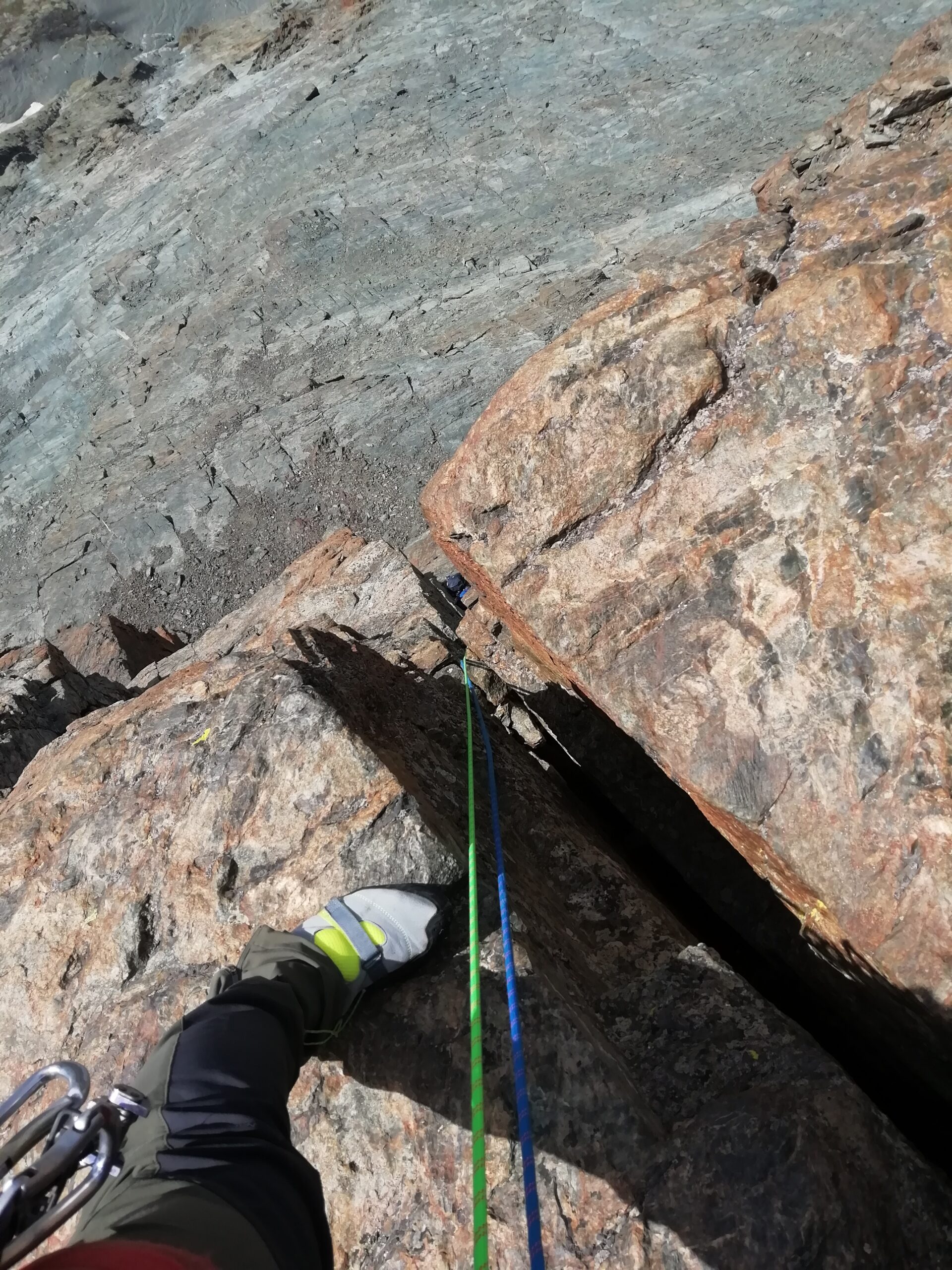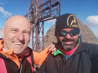 Dopo lungo corteggiamento, finalmente riusciamo in questa splendida via. Grazie al mio amico fraterno Fulvio,da cui nasce l’idea di questa linea, e grazie alla sua perseveranza e tenacia. Grazie ad Andrea che si è fatto coinvolgere e ha tirato un tiro durissimo…. Non dimenticherò mai il bivacco sotto il dado, con quelle stelle che sembravano così vicine, con dietro di noi la nera bastionata del dado. E non dimenticherò mai l’uscita dalla via e la vetta,che così tanto mi ha dato. Grazie Fulvio e Andrea.