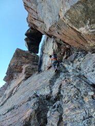 Dal rif vallanta attaccare la cresta inizialmente ampia ed erbosa.Saire inizialmente sul filo, poi spostarsi a sin per un lungo tratto fino ad arrivare in vista del dado, dove la cresta si raddrizza e presenta un passaggio obbligato, uno scalino alto circa 3 mt (IV). Proseguire per facili detriti(ma non banali) fino ad un arco di roccia che forma camino con la terrazza sporastante. Scalare il camino che porta proprio sotto la verticale del gran diedro. Proseguire quindi in un ampia fessura verso destra e da un masso uscire su un ripiano. Seguirlo per 10 mt verso destra poi salire una seconda fessura camino (III+) parallela alla precedente fino ad un grande terrazzo. Superare un camino ostruito da un grande masso (IV-) che porta ad un sistema di cenge che in breve portano sul piano sommitale e per questo alla vetta. (ore 7-8)