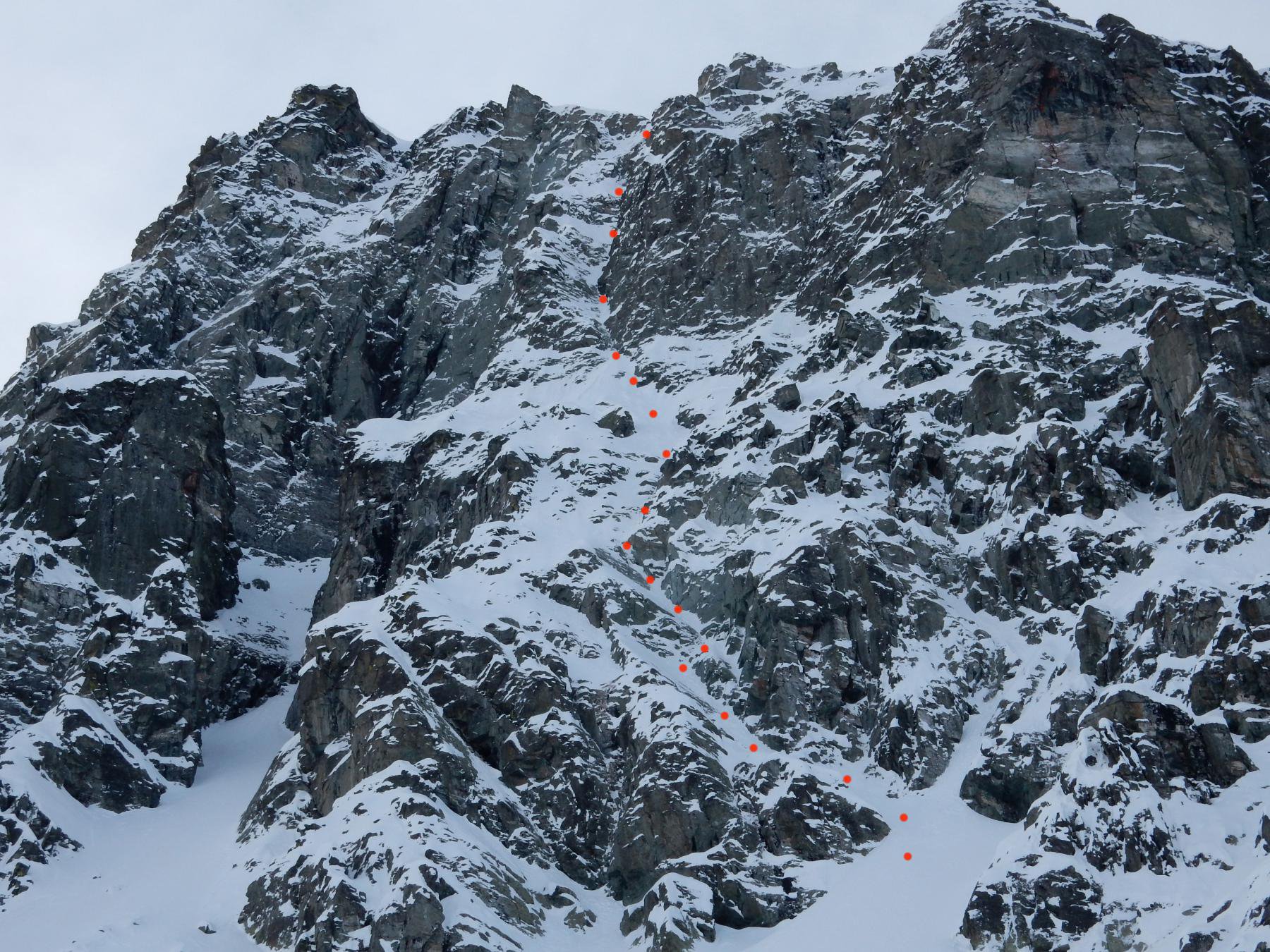 La via si insinua tra i canalini ghiacciati che solcano la parete nord del Viso Mozzo delimitata a sinistra dal Canale dei campanili e a destra dal canale nord di rocca tournè.