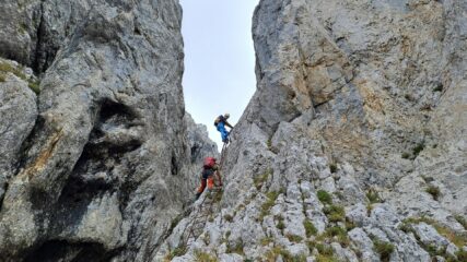Più che una ferrata, è una salita di facile alpinismo facilitata da catene e cavi e nei posti più verticali da vecchie scale.