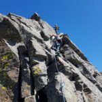 Mantenere il filo, superando un tratto impegnativo in una spaccatura. Superato questo tratto la cresta è piu facile, ma conviene stare sul filo perché la roccia è più bella. Un ultima impennata porta sulla vetta del picco Montaldo.