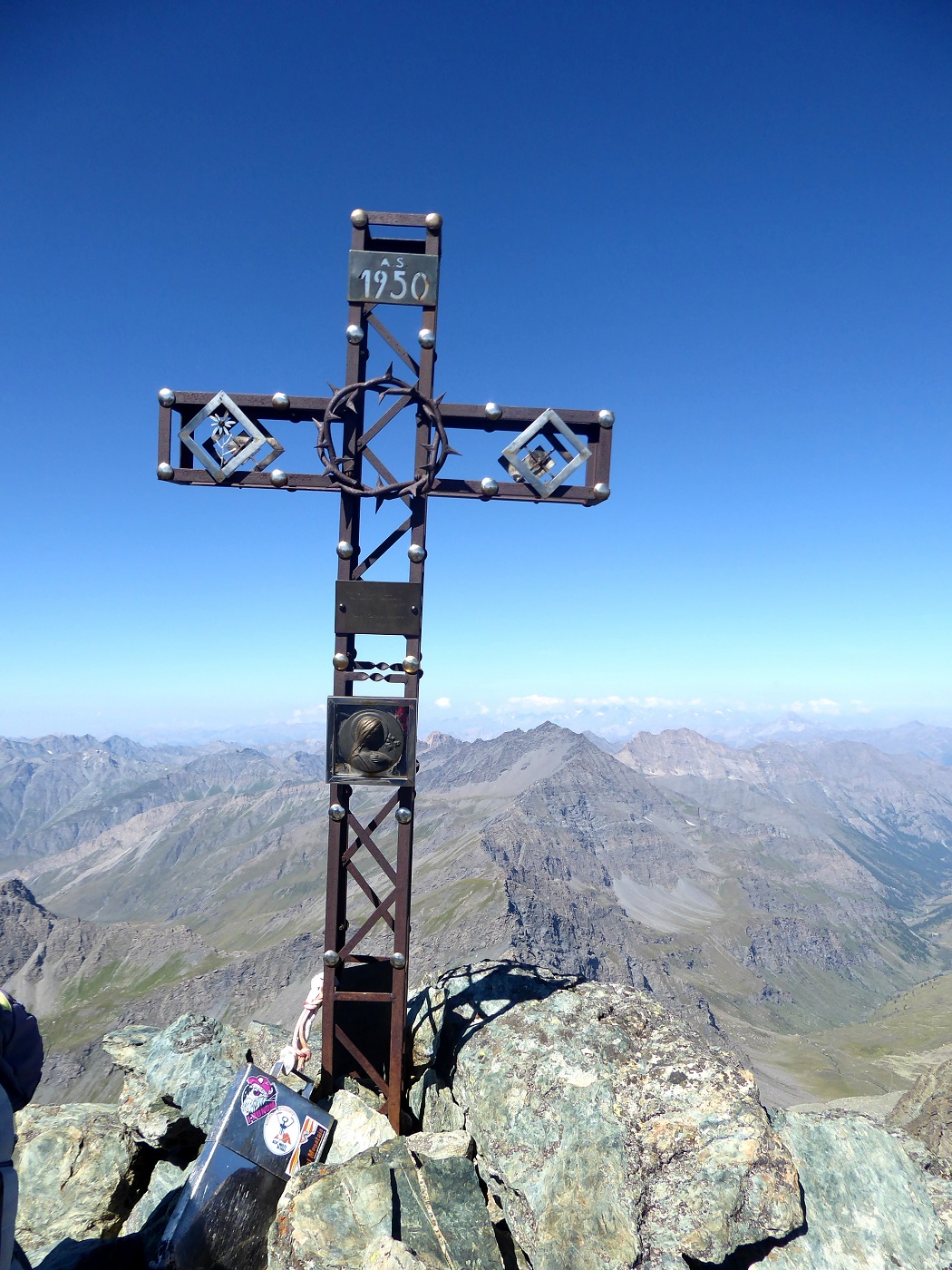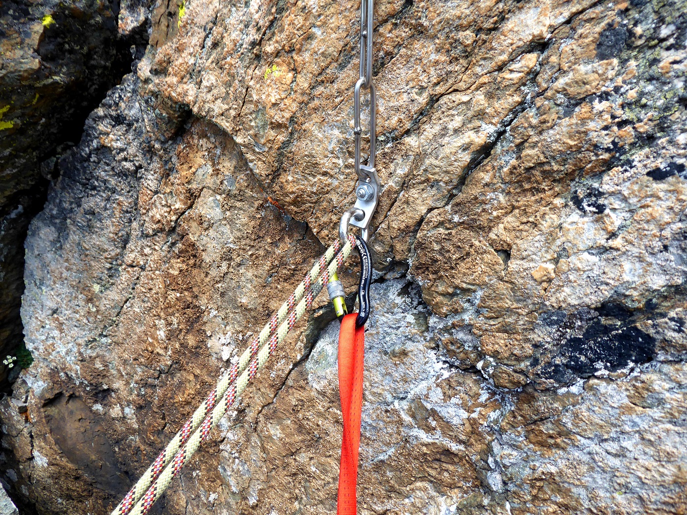 Montagna molto bella, per di più inserita in un ambiente grandioso e selvaggio dominato dall’incombente mole del Monviso. Purtroppo per arrivare alla base della montagna, ed ovviamente per il rientro la traccia, dove esiste (non si trovano assolutamente indicazioni, solo ometti e spesso fuorvianti!), è veramente molto disagevole, con alcune pietraie veramente pericolose per gambe e caviglie. Dall’inizio della cengia diagonale le cose migliorano, anche se nella prima parte bisogna prestare attenzione a molto materiale mobile. Noi abbiamo sicuramente sbagliato itinerario perché, una volta entrati nel canale, abbiamo seguito una serie di soste, attrezzate anche per le calate, che ci hanno fatto salire praticamente “dritto per dritto”. Non ci sono difficoltà particolari ma alcuni brevi passaggi di 3° e forse 3°+ si trovano. Poco sotto la cima un traverso a destra, facile ma abbastanza esposto, ci ha portati sulla cresta sommitale a non più di 40 m. dalla croce. Oltre alle soste/calate sul percorso pochissimo materiale. La discesa l’abbiamo effettuata con numerose calate in doppia, le prime quattro piuttosto verticali. Avevamo una mezza da 60 m., cosicché abbiamo evitato il nodo ed il rischio di incastri. Dalla cima panorama notevole. Avvistati alcuni camosci a lato del canale ed uno stambecco.