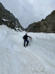 Partiti da pian del re per salire la nord del Monviso,ma le condizioni non sono per niente buone.Diverse cordate giunte sotto al ghiacciaio sono tornate indietro,io e Patrick proseguiamo con l’idea comunque di combinare qualcosa.Effettivamente la strettoia è in condizioni di disfacimento totale,e saliamo veloci come lepri.Dal ghiacciaio andiamo a prendere la normale sud del Visolotto,che con ancora parecchi tratti nevosi è molto interessante.Discesa ok,poi aggiriamo il Visolotto e risaliamo al passo Due Dita per poi scendere di nuovo a pian del re dal canale N-e su ottima neve.
