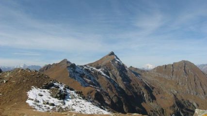 La giornata era bella, calda, la compania uona, tutto sembrava essere l’ideale per una bella gita autunnale : però… nel lungo traverso sul macereto esposto ad OVEST vi era molta neve che copriva gli spazi tra un masso e l’altro, per cui per non rischiare le gambe ci siamo fermati salendo i pochi metri fino alla cima al termine dello spallone.