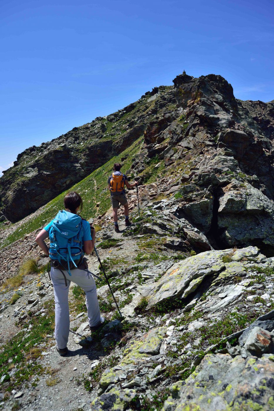 La gita si svolge tutta su sentieri ottimamente tracciati e segnalati. Partiti dal rifugio Arp, siamo saliti prima al Corno Vitello e poi al ritorno abbiamo percorso la panoramicissima cresta che collega la sella q. 2778 m con la Punta Palasina fino al colle omonimo (sentiero 3D, ottimamente tracciato e con alcuni brevissimi tratti attrezzati). Discesa dal Colle Palasina passando per gli omonimi laghi. Il percorso e’ molto interessante e vario, con panorami stupendi. Difficolta’ EE sul pendio finale del Corno Vitello e su alcuni tratti aerei della cresta, per il resto E.