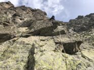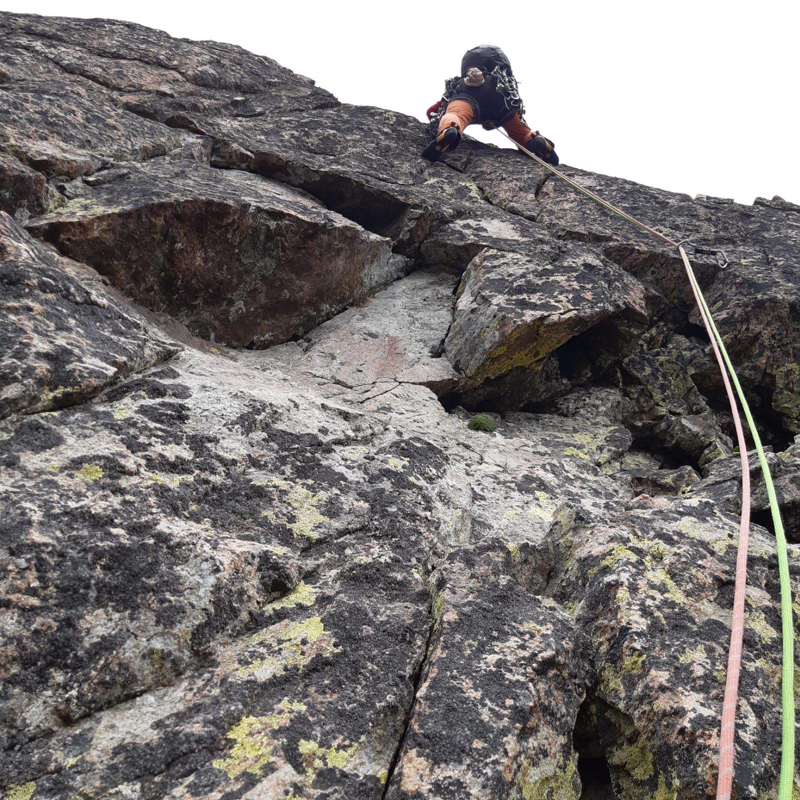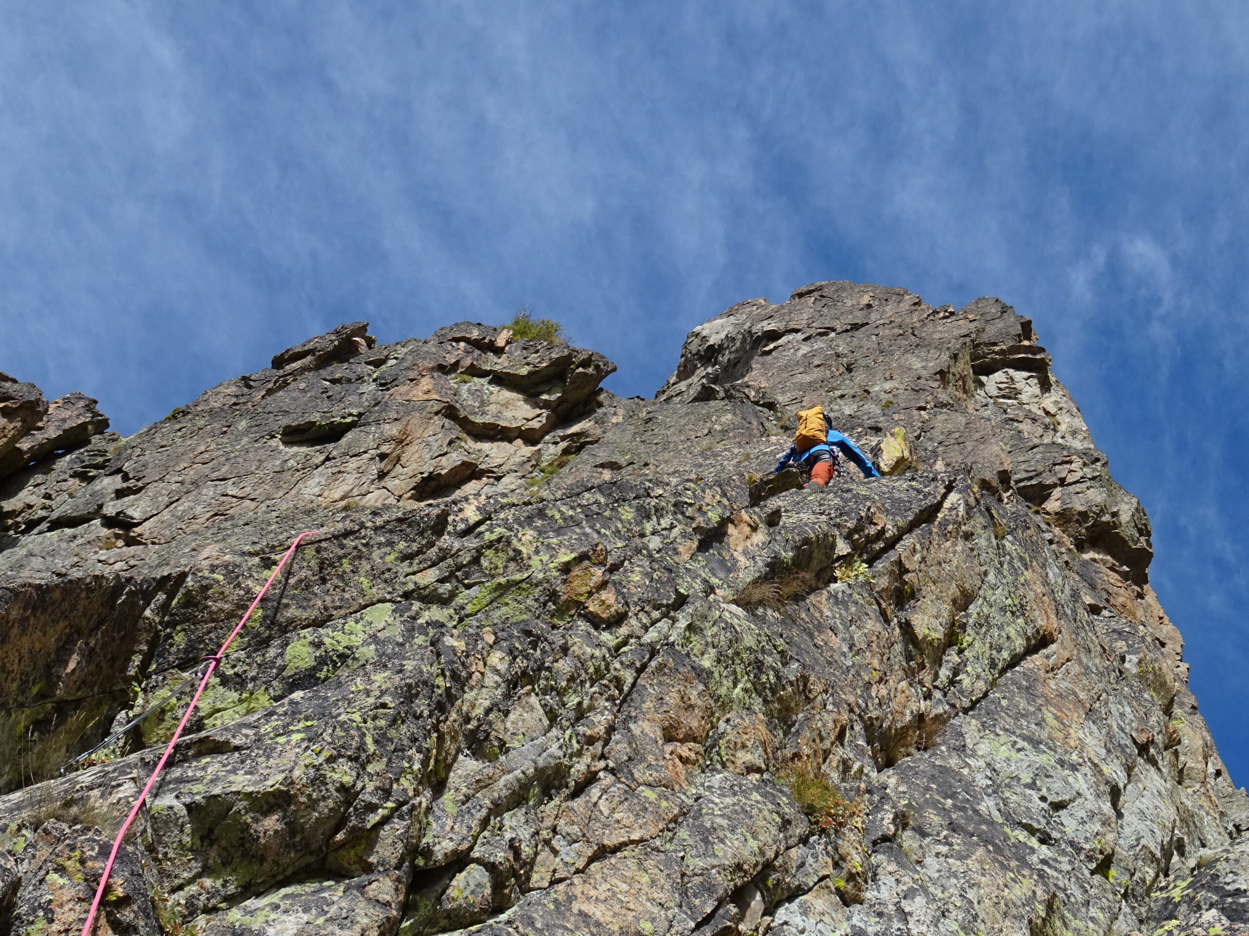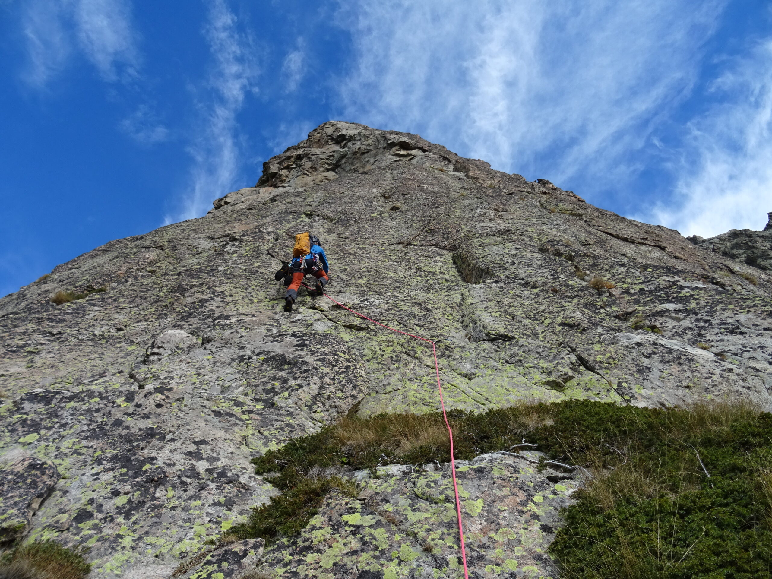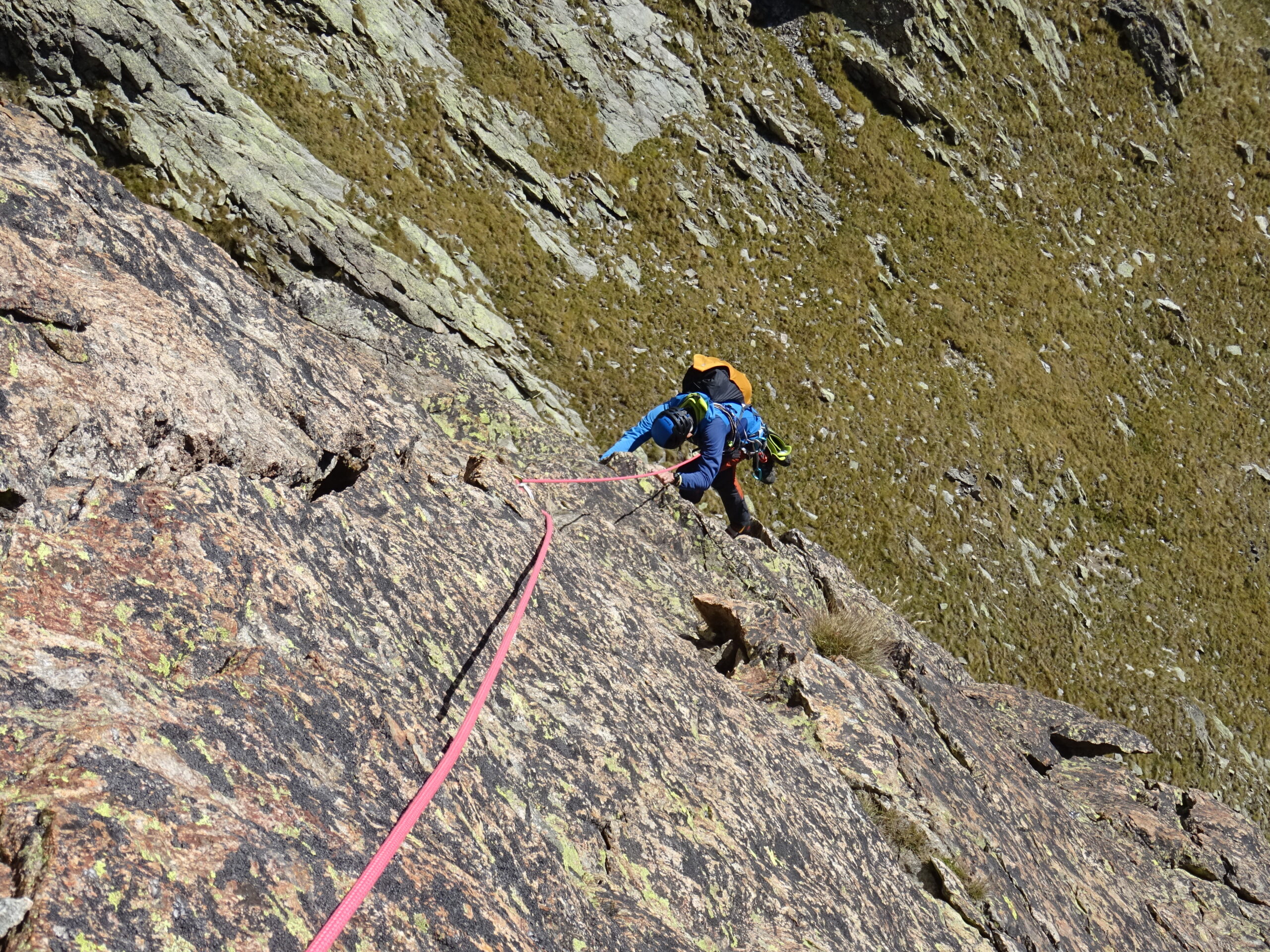 Dalla base dello sperone SE (ometto) ignorare il fix con cordino sulla placca a sx e attaccare nel punto più basso, sulla dx dello spigolo.