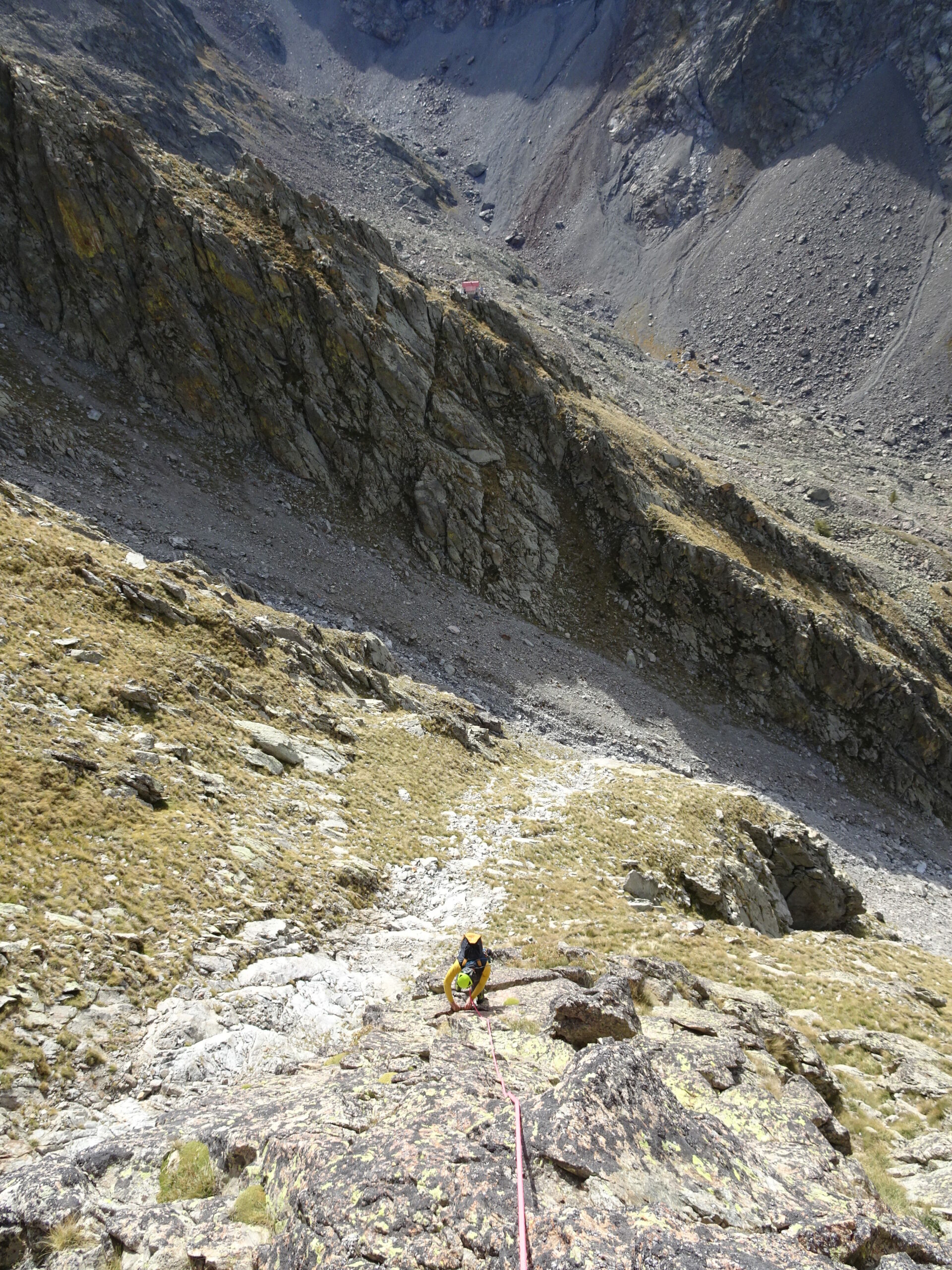 - L5: proseguire facilmente nel canale-camino (III-II) che in breve porta in vetta (questo tiro si può eventualmente unire con il tiro precedente, attenzione agli attriti). 15m