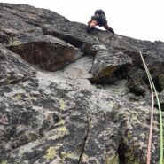 - L2: ignorare i fix a sx e salire sopra la sosta sul filo di spigolo (breve passo di IV-), quindi più facilmente proseguire sul filo che qui cambia direzione e porta ad un larice con cordoni dove si sosta. 25m