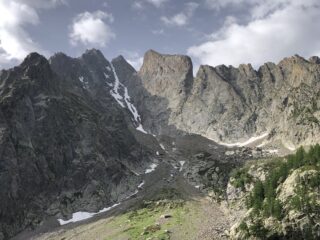 Ci siamo avvicinati salendo direttamente il canalone dal basso, senza andare al rifugio: non si tocca più neve.