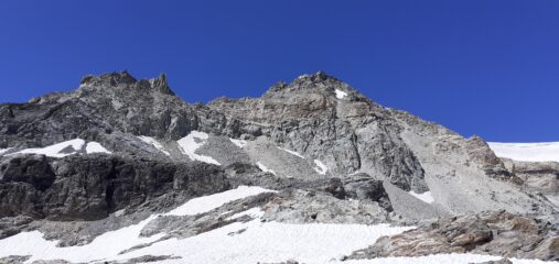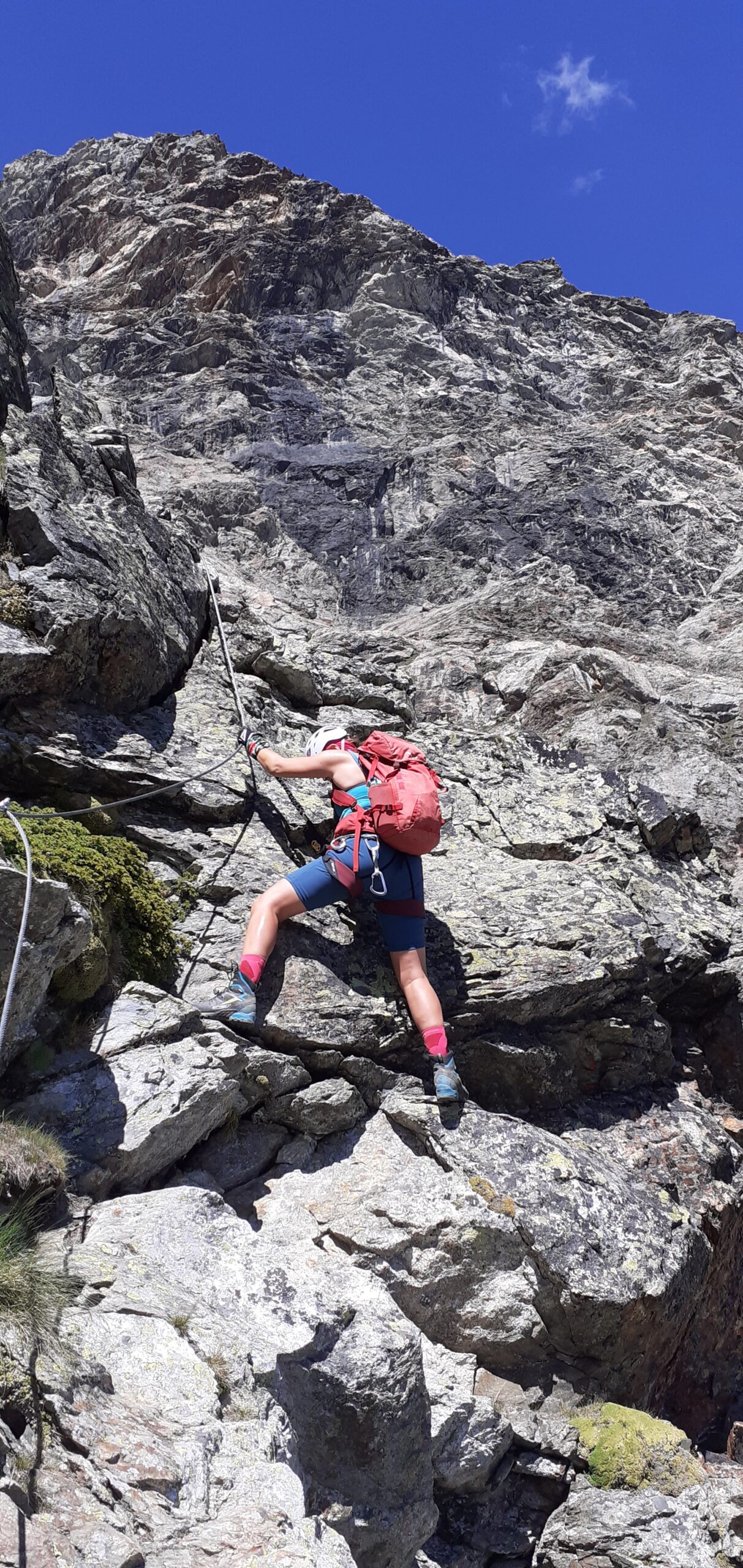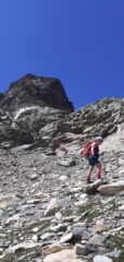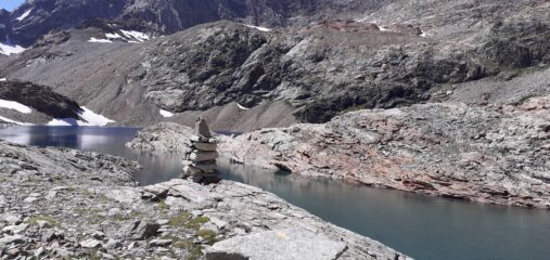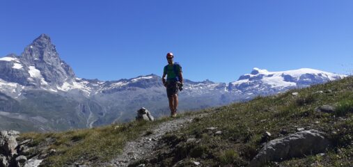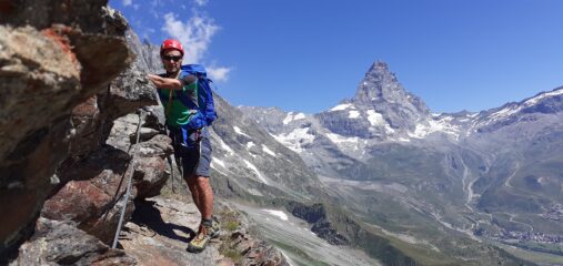 Lungo giro ad anello con partenza e ritorno a Cervinia: salita della via ferrata dello Sperone del Vofrede, passaggio del residuo ghiacciaio e del colle omonimi (possono essere utili i ramponi) con discesa sugli sfasciumi del versante opposto fino ad arrivare al Gran Lago, al rifugio Perucca e al bivacco Manenti. Infine risalita alla panoramica Finestra di Cignana e interminabile sentiero balcone per tornare a Cervinia. Un viaggio di 19 km e .1.640 metri di dislivello seguendo in gran parte l’Alta Via numero 9. Ambiente selvaggio e pochissima gente sul percorso. Con Daniela.