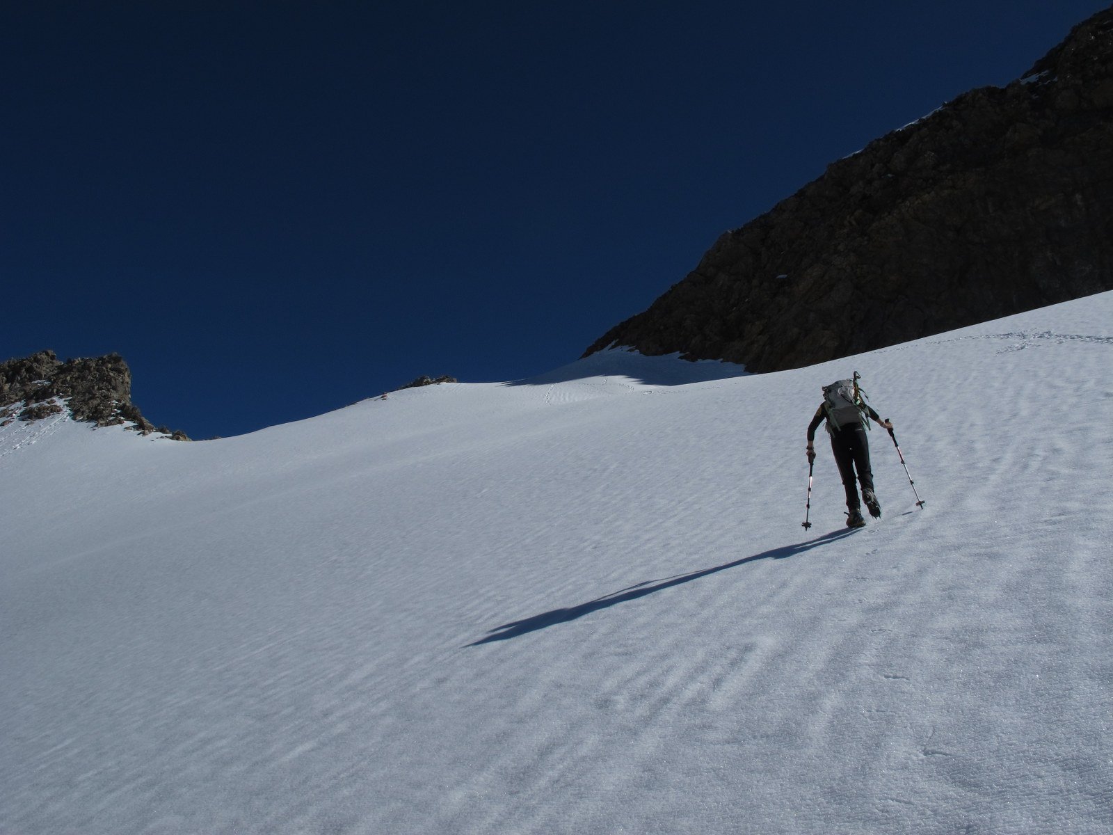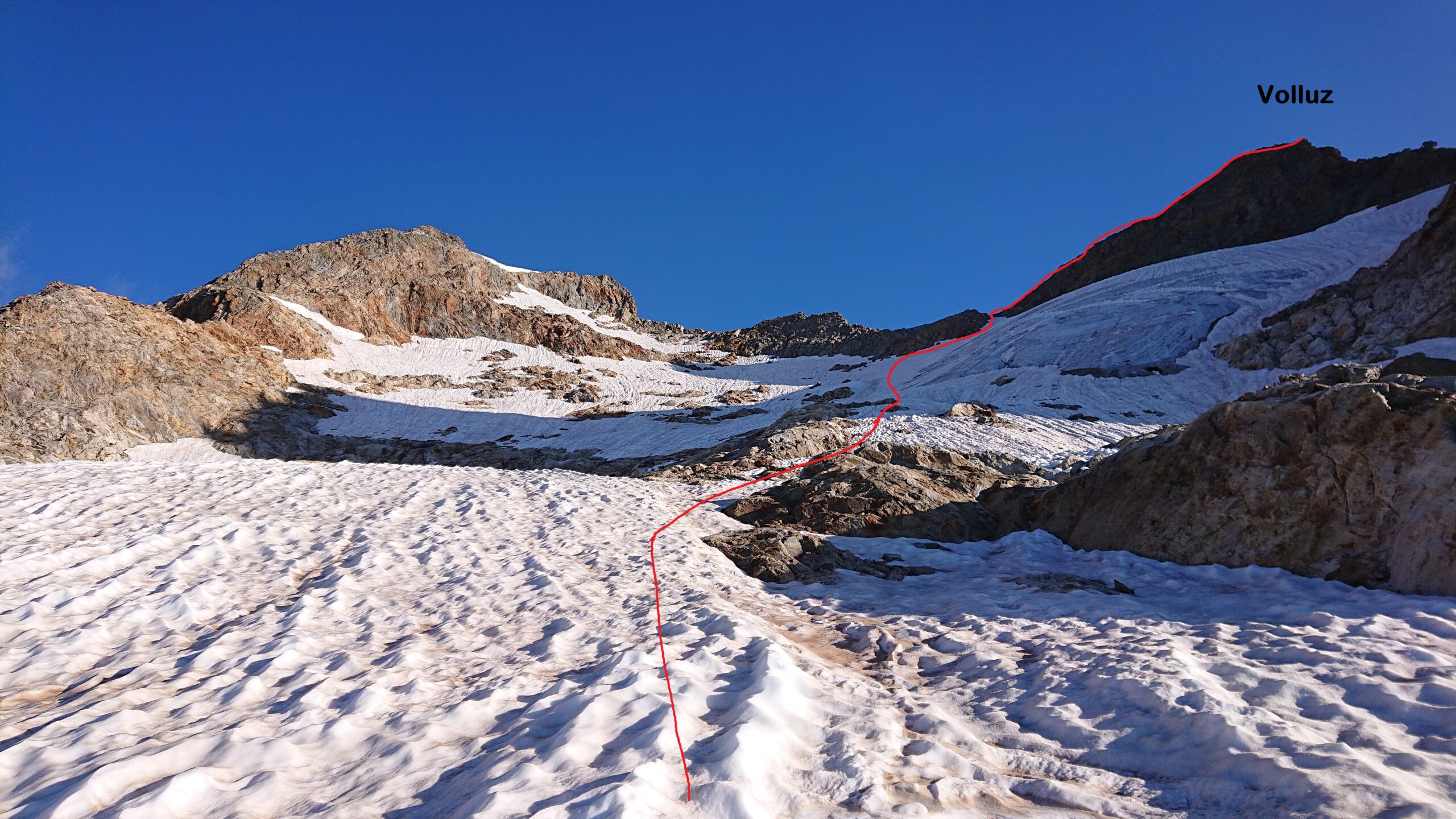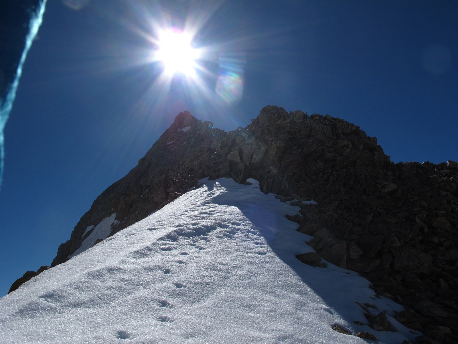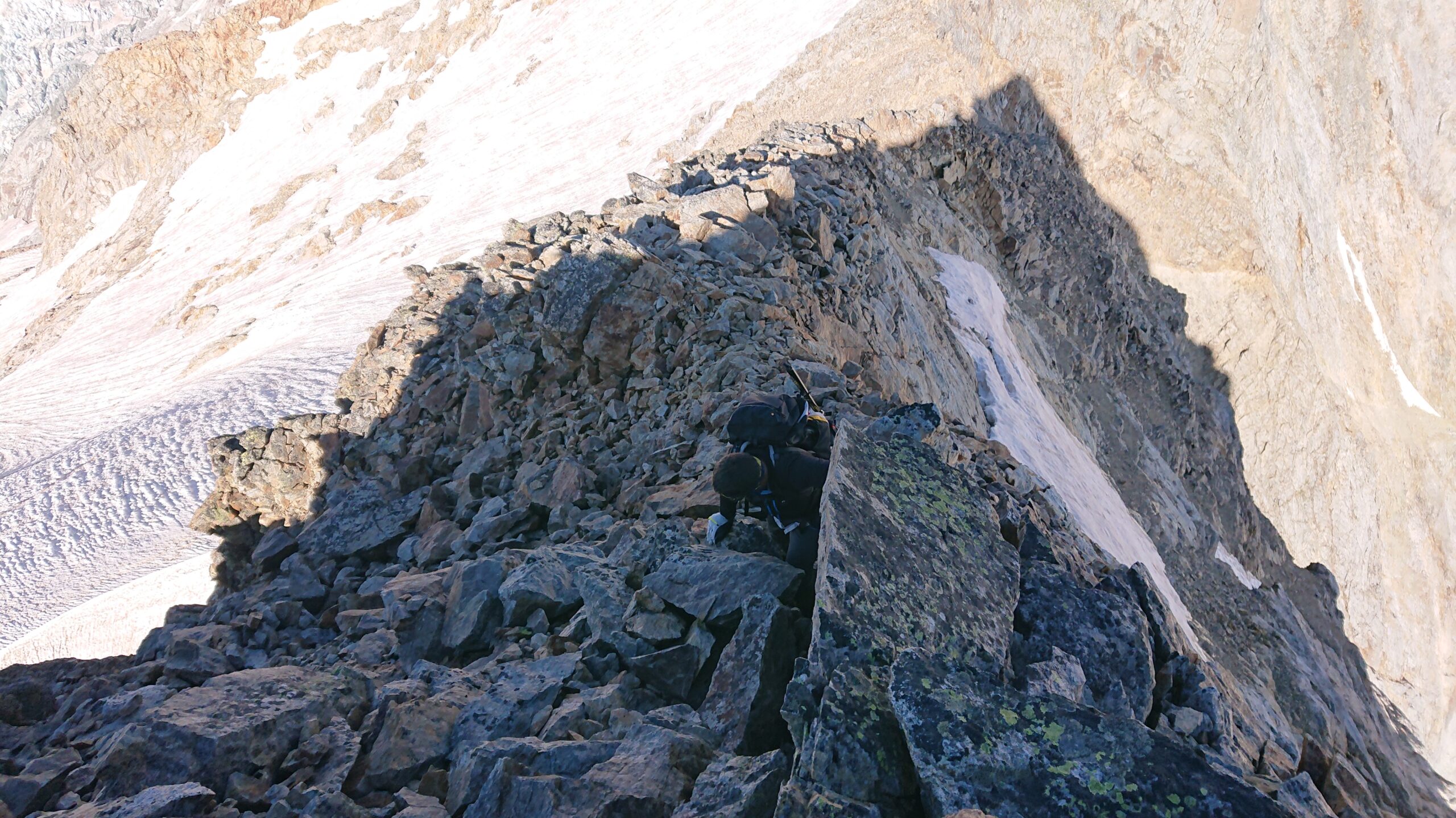 Raggiunta la sella, stando sui nevai alla sx del ghiacciaietto per evitare piccoli crepacci, senza difficoltà incomincia la facile cresta rocciosa che in breve porta facilmente in vetta. Cresta composta prevalentemente da blocchi instabili ma, stando il più possibile sul filo, si sale abbastanza bene, prestare attenzione perchè i salti da entrambi i lati non permettono errori.