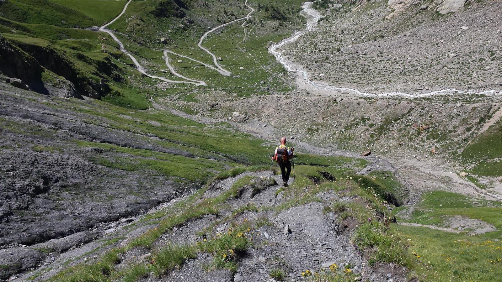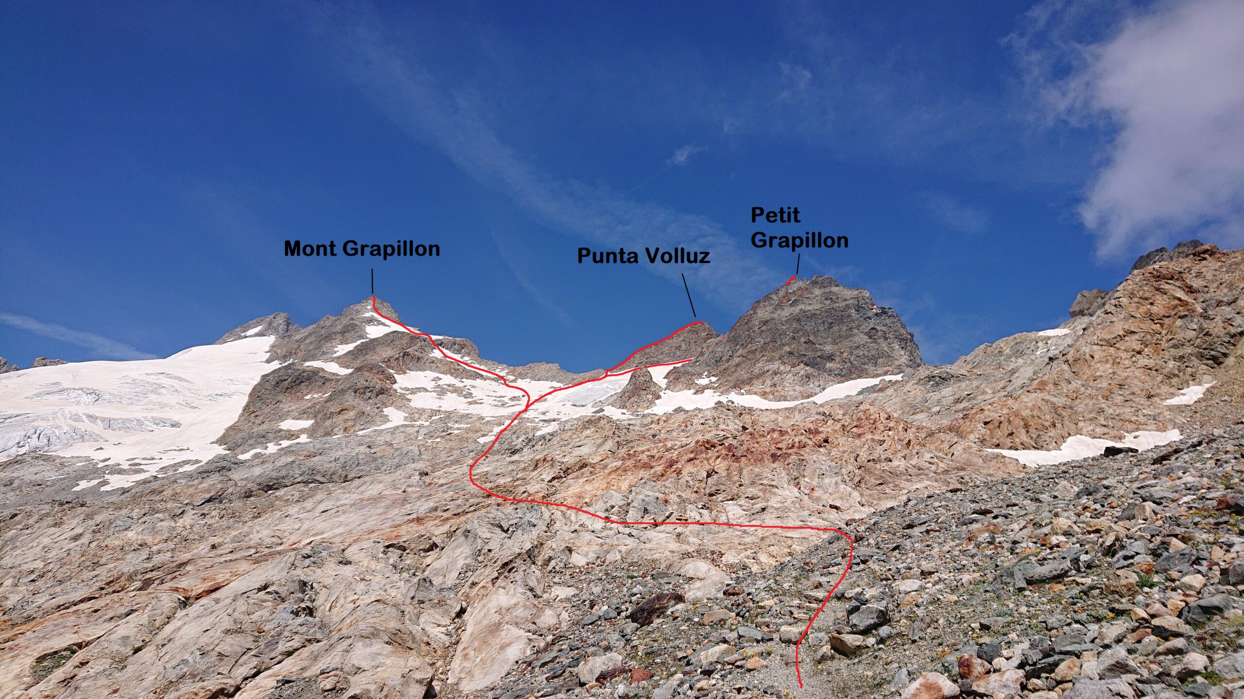 Da Arnouva seguendo la poderale si arriva poco sotto il Rif.Elena, punto da dove si prende il sentiero 24 per i bivacchi, raggiunto il bivacco Fiorio si segue inizialmente il sentiero per il M. Dolent (ometti) per un breve tratto verso nord prendendo come riferimento l’evidente palo della stazione meteo, poi piegare a dx e puntare alla grossa sella sovrastante un piccolo ghiacciaio tra la pointe Volluz a sx e il petit Grapillon a dx.