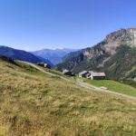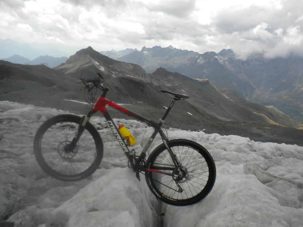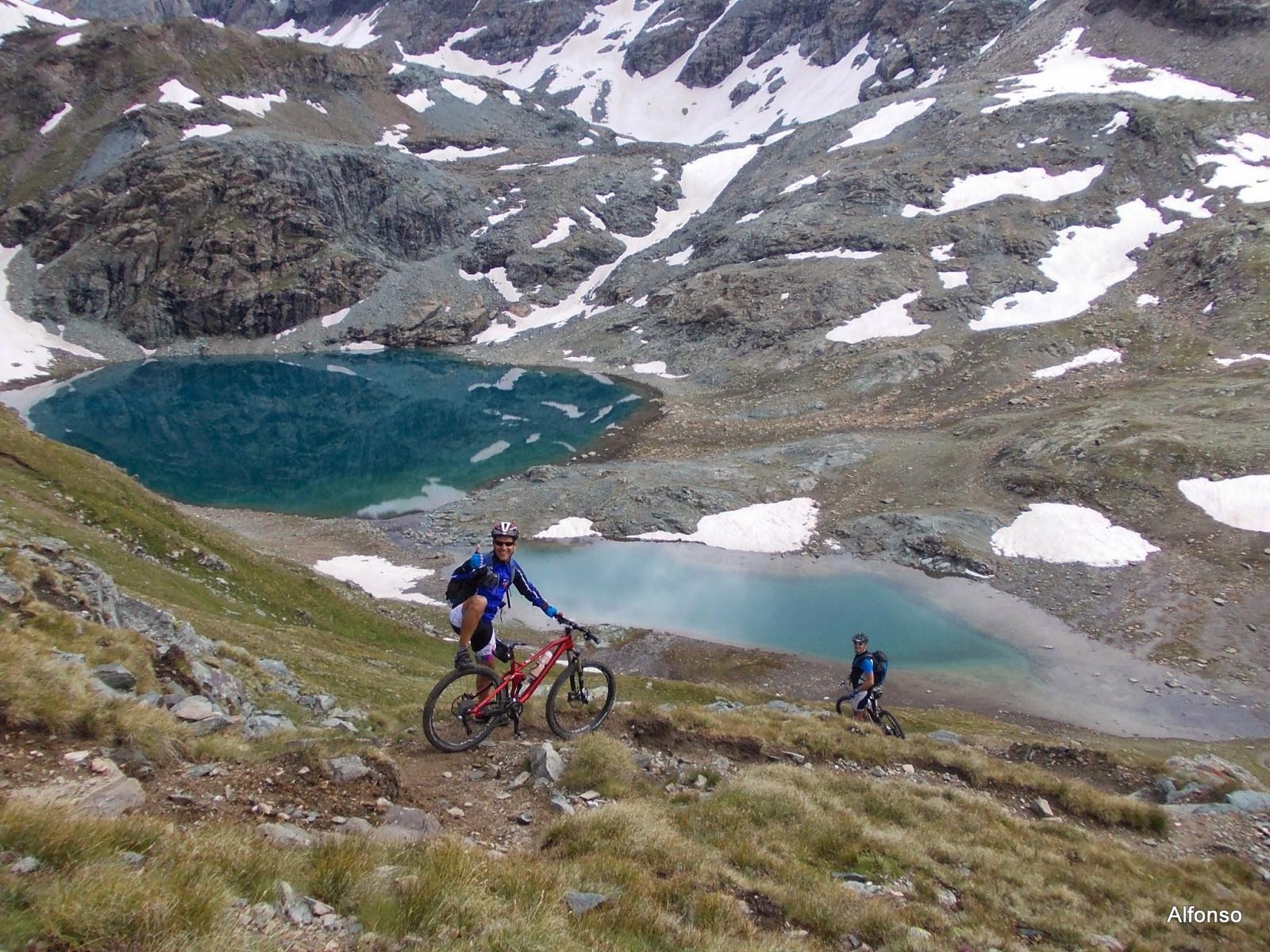 Partenza dal campeggio di Arolla: la prima parte segue una bella strada sterrata sino al villaggio Remointse de Pragra. Di qui lungo traverso verso la Cabane des Aguille Rouge, con tratti a spinta, qualche portage ma anche molti tratti in sella. Dalla Cabane si sale sulle morene, ancora qualcosina in sella ma ora spingere e portare la fanno da padrone. Si arriva sul ghiacciaio, generalmente non crepacciato in questa sezione. Il superamento di una anticima prima della vetta vera e propria richiede attenzione: vi sono alcuni tratti rocciosi friabili ed esposti non facili da fare portandosi una bici; vale anche per il ritorno… Discesa: La ciclabilità inizia dalla vetta. Raggiunta l’ anticima si scende in un ambiente di alta montagna su terreno friabile ma con buona tenuta; un solo tratto più difficile con roccie piu’ grosse (S4) richiede di individuare la linea giusta, magari con qualche tentativo. Si attraversa il ghiacciaio (bellissimo), si scendono le morene, poi il verde/giallo di praterie fiorite e, poco prima di La Gouile, si arriva al lago Blu.
