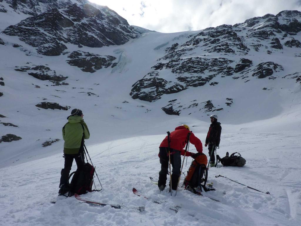 Alcuni amici hanno sceso la lingua glaciale e l’hanno trovata ben sciabile, io ed altre menti abbiamo tenuto la sx per un bel pendio che poi ci ha infilato in un paio di ripidi canalini da scendere raspando (sconsigliato!)