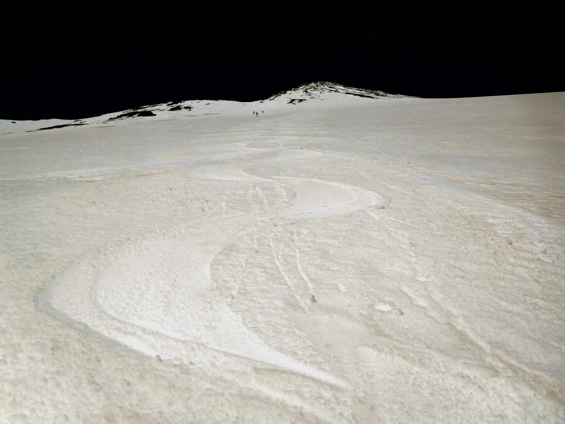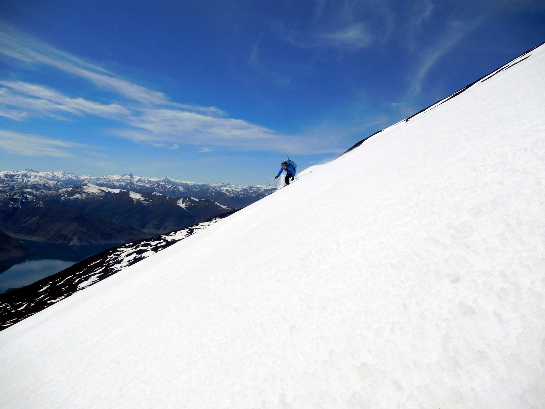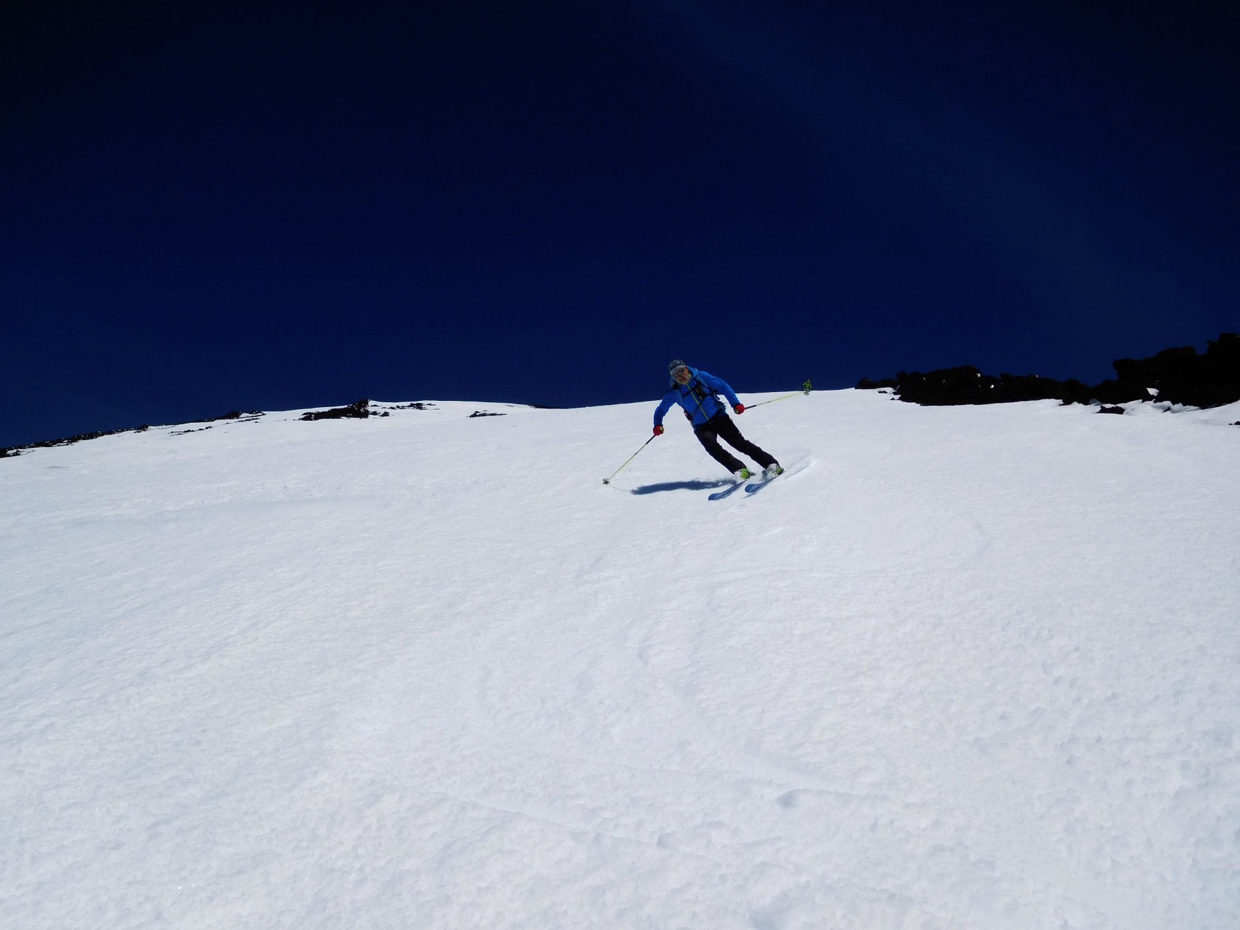 Noi siamo saliti per il versante nord ovest diretto. Portage fino alla fine dell’impianto e poi passaggio diretto in modalità ramponi considerando pendenze e neve dura dura. Discesa dalla punta sci ai piedi prima per il versante nord est per 200 mt (evitando così il tratto terminale della salita ghiacciato e con neve irregolare) e con breve spostamento rientro sulla NO. Neve e pendio da lacrime agli occhi su ottima neve primaverile. Pendio che visto da sotto sembra breve ma in realtà non finisce mai. Ambiente circostante semplicemente superlativo! Pernotto in modeste cabanas a circa 10 km dalla partenza appena fuori dal parco. Con Valter,Elena,Nico e Gian!