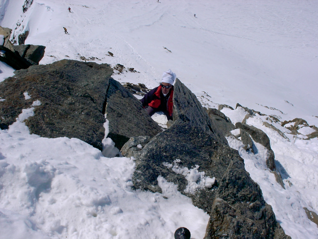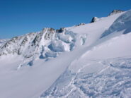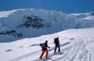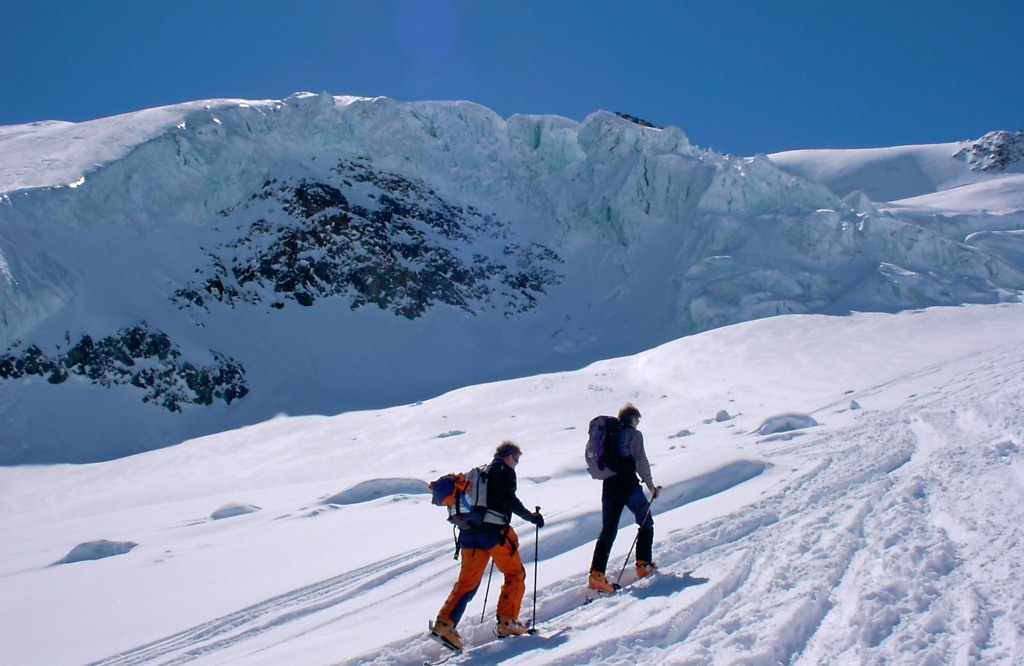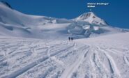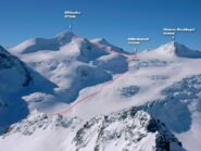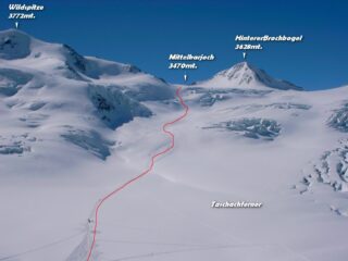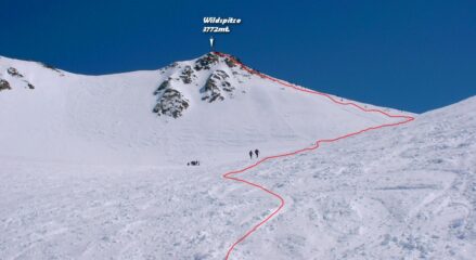 Dal Mittelbergjoch3166mt. si scende sul lato opposto con un leggero traverso il ripido pendio di un centinaio di metri che raggiungere la piana sul ghiacciaio Taschachferner. Da qui si salgono i pendii direzione sud-ovest passando sotto una grandiosa zona di seracchi fino una grande zona pianeggiante sotto Taschachwand e il Brochkogel dove si gira a sx e si punta alla evidente cima della Wildspitze. Passato il lungo pianoro dopo un tratto più ripido sotto la cima si raggiungere la base della ripida cresta dove si depositano le racchette, la si risale con ramponi passando qualche passaggio esposto su roccia sull’ultimo tratto fino ad arrivare alla croce di vetta della Wildspitze 3772mt. Dalla cima panorama grandioso su tutte le vette di confine, sulle Dolomiti e sulle cime della vicina Val Senales.